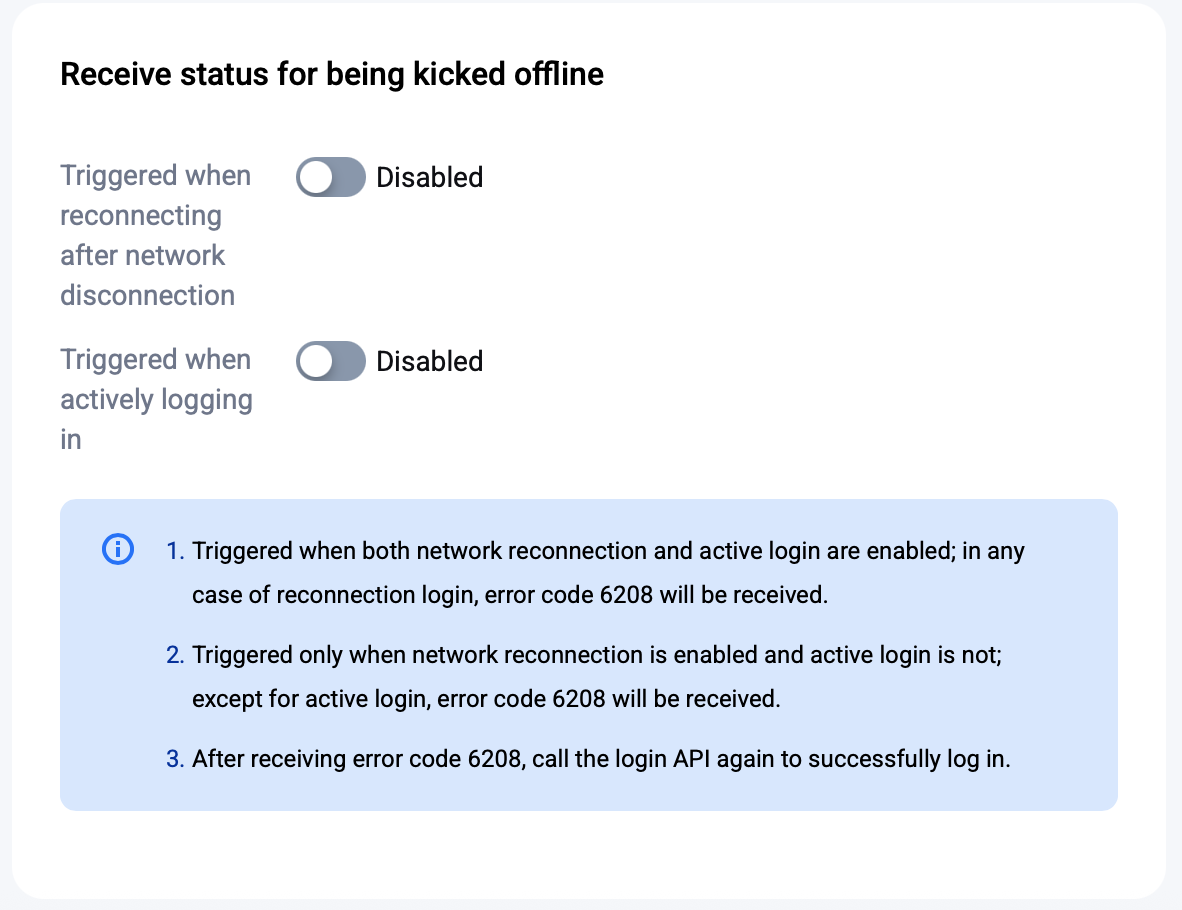 On the login and message page, within the section for receiving the kicked-offline status, you can choose to enable or disable this feature. The buttons are categorized into "Reconnect after network disconnection" and "Active login":