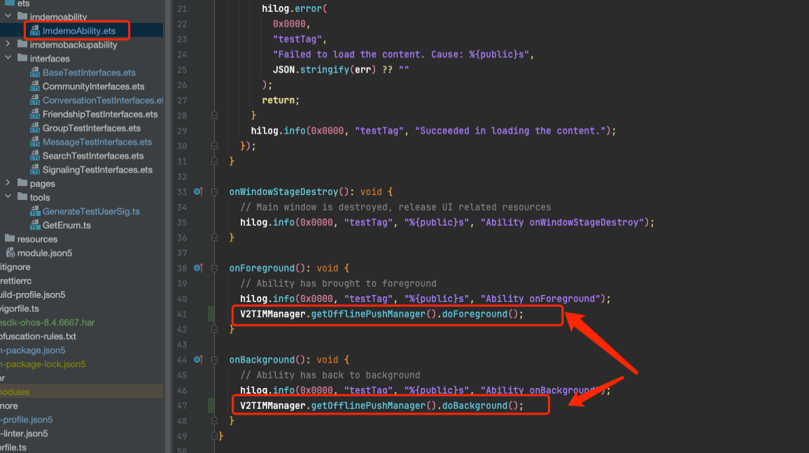 Solution: In the HarmonyOS project, refer to the following screenshot's corresponding position to add two SDK APIs for actively triggering reconnection.