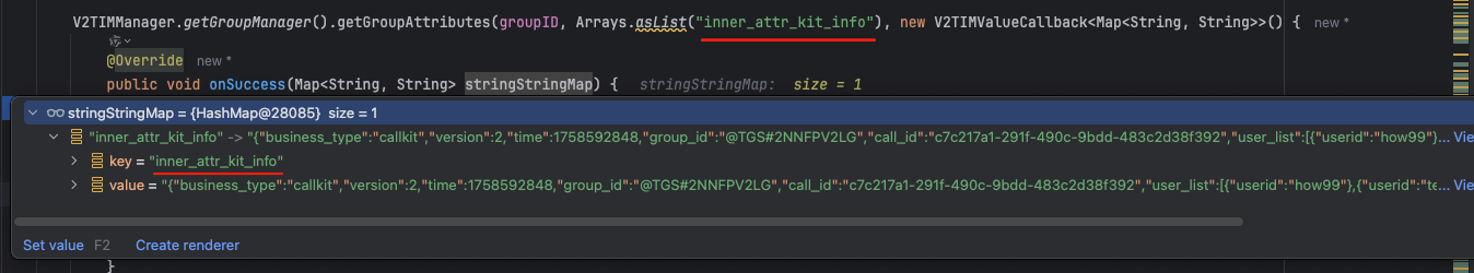 Call getGroupAttributes() to get the Group attribute API, parameter two keys: pass inner_attr_kit_info.