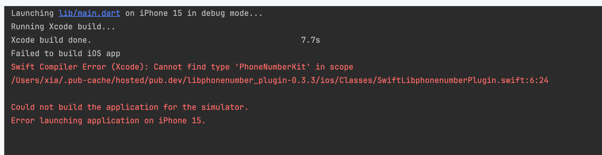 Swift Compiler Error(Xcode): Cannot find type 'PhoneNumber/Users/xia/.pub-cache/hosted/pub.dev/libphonenumber_plugin-.3.3/ios/Classes/SwiftLibphonenumberPlugin.swift:6:24 Could not build the application for the simulator. Error launching application on iPhone 15.