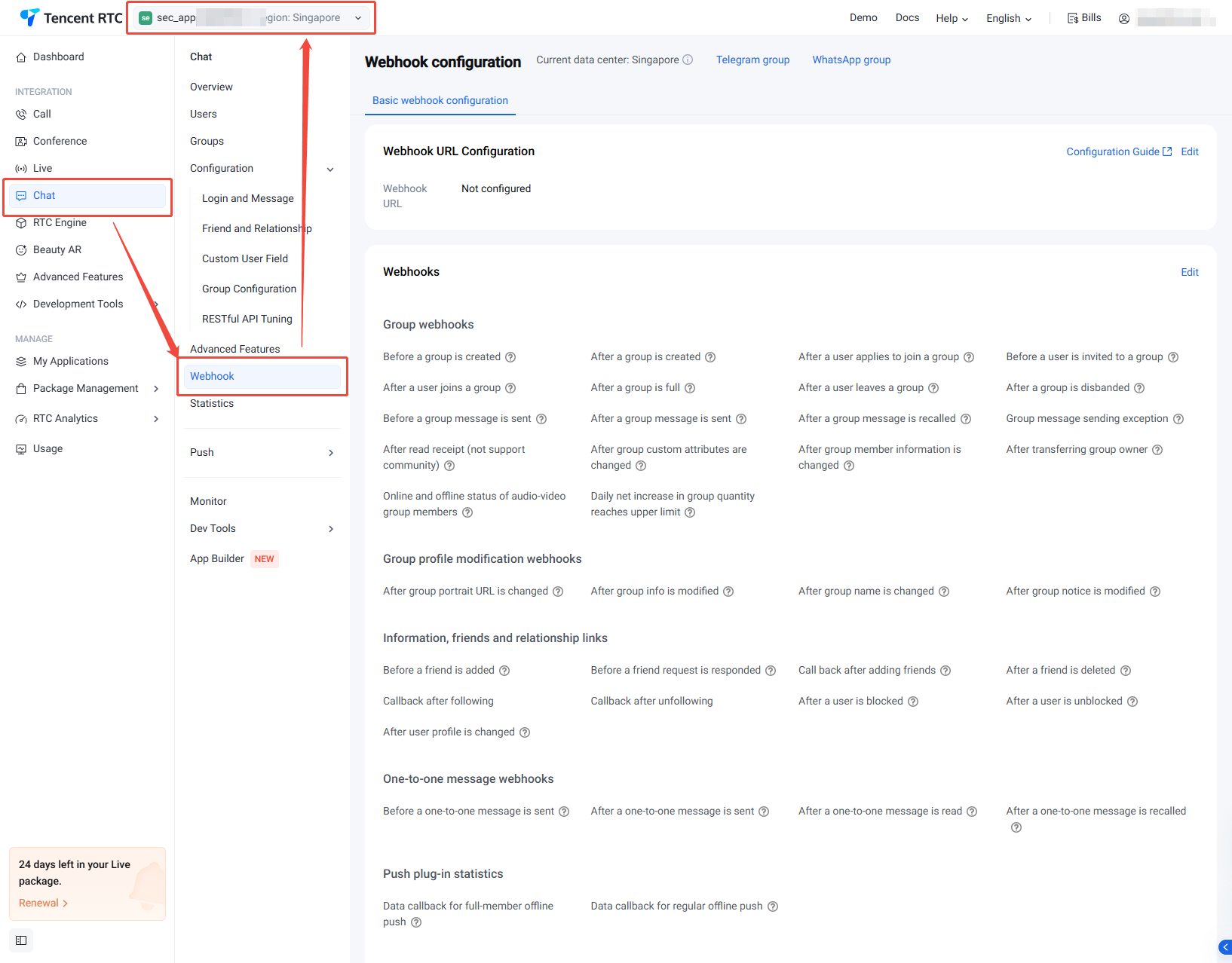 Log in to the Chat console, select Chat > Webhook in the left sidebar, and select target application at the top. You can configure the callback URL and enable which callbacks based on actual business needs.