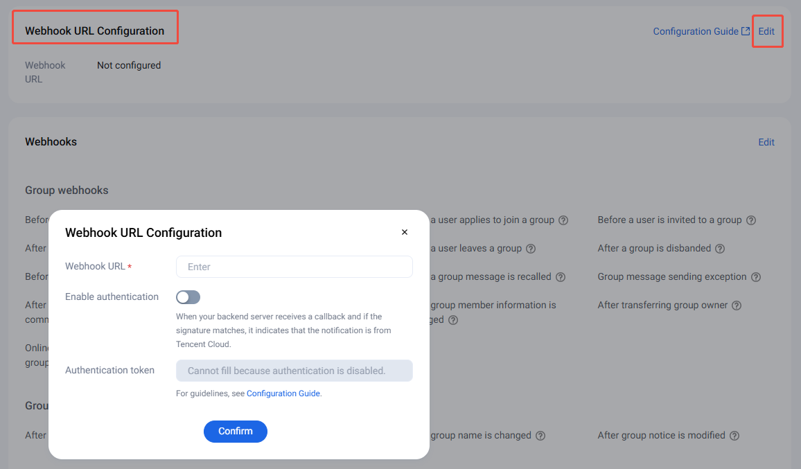 1. On the Webhook Configuration page, click Edit in the webhook URL configuration area.