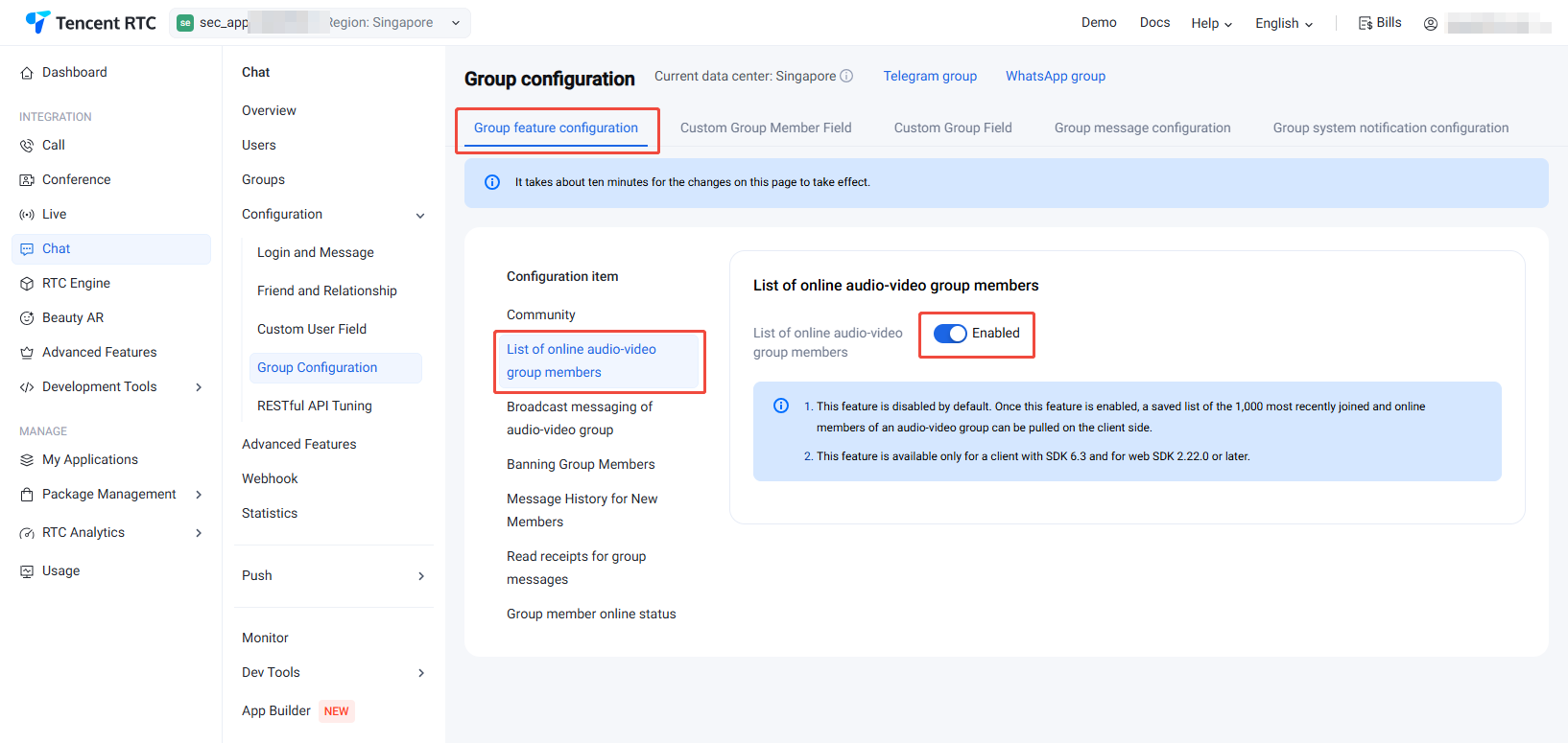 To enable the online status callback for AVChatRoom members, first toggle on the group member online status switch in Chat > Configuration > Custom User Field.