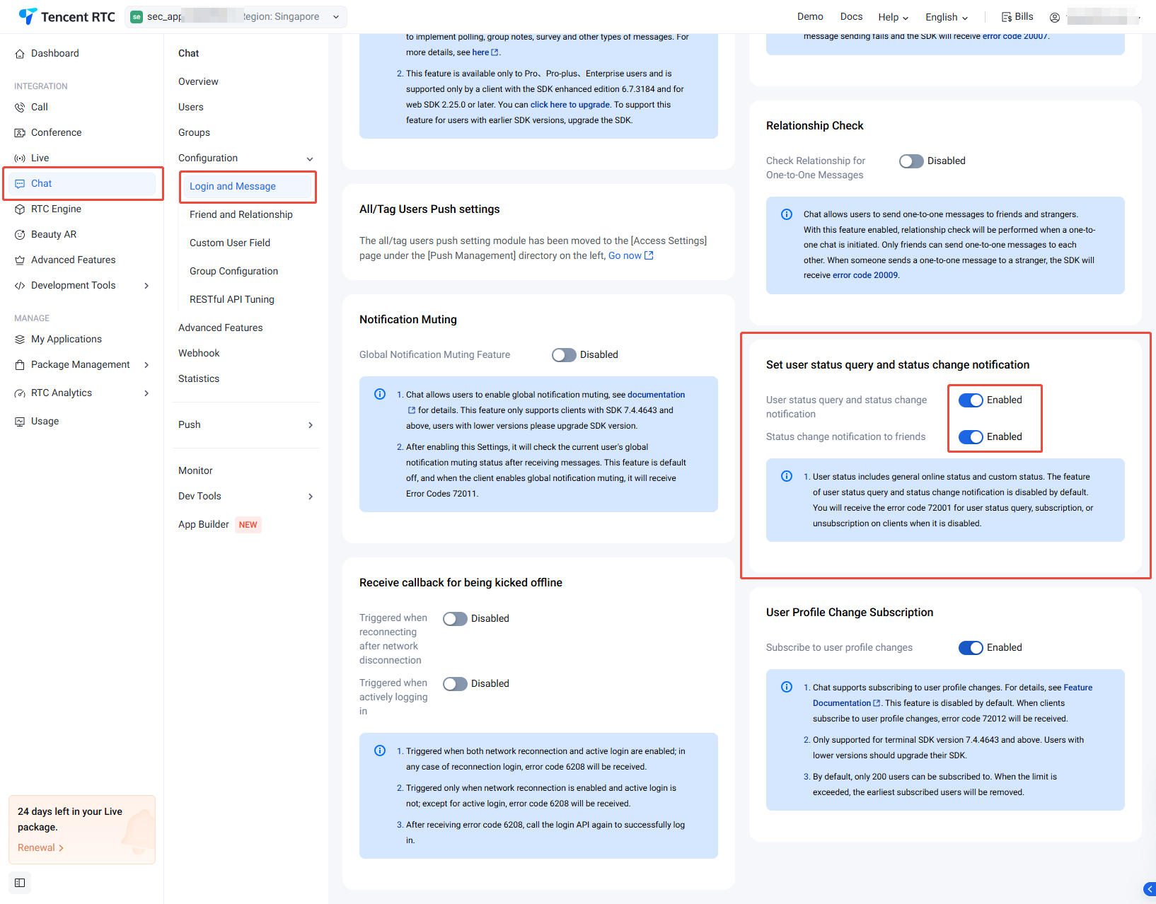 To enable the Online Status Callback, first toggle on the User Status Inquiry and Status Change Notification configuration switch in Chat > Configuration >Login and Message.