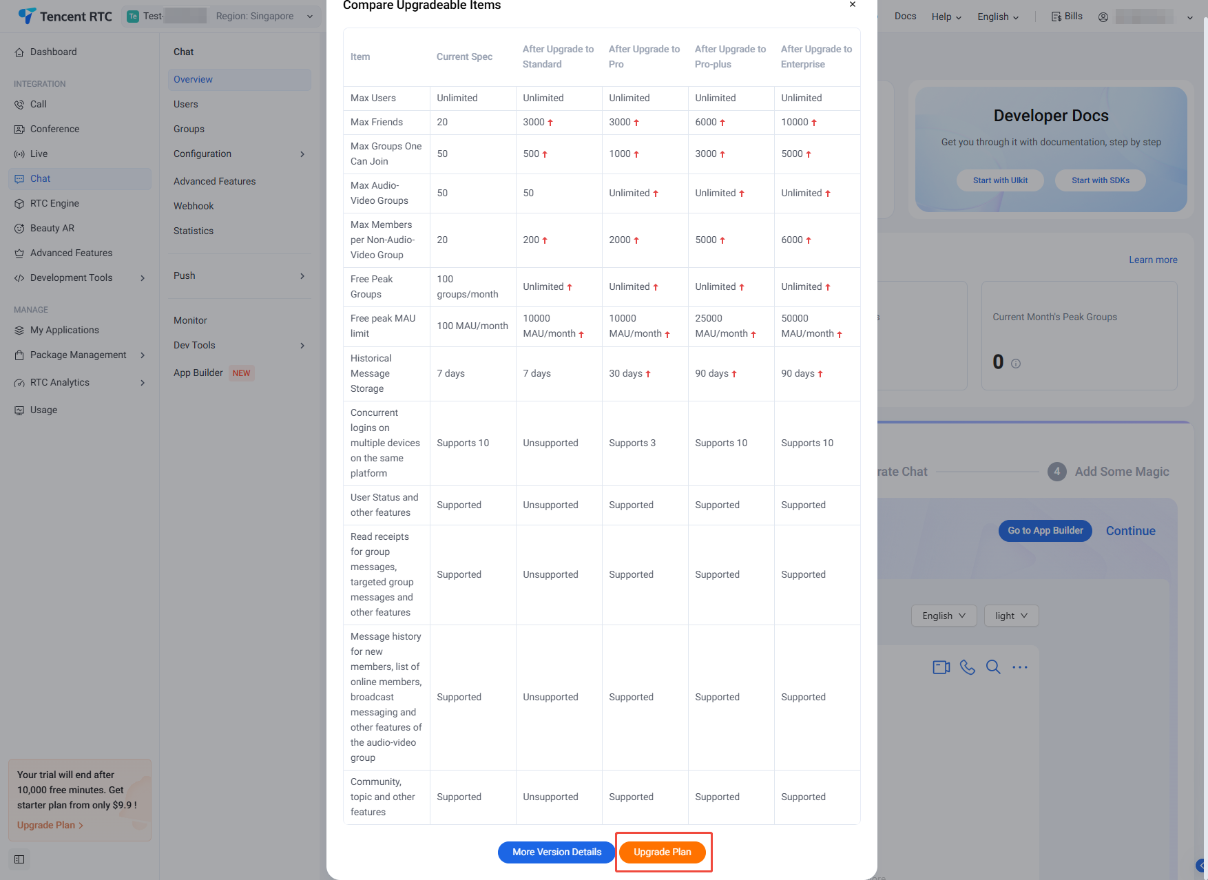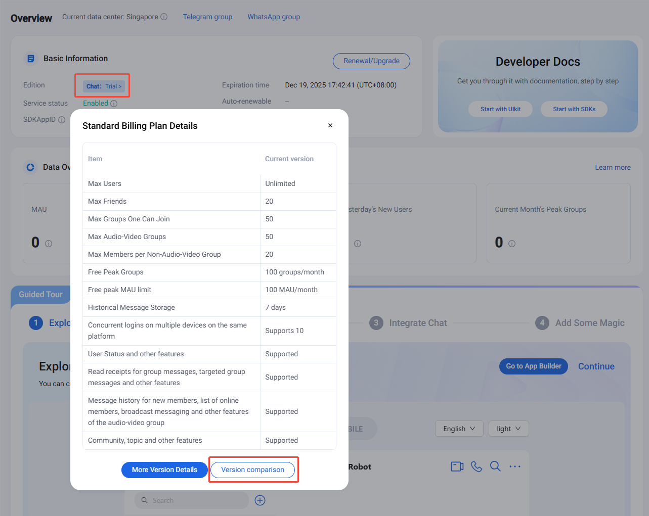 This document describes how to create Free Trial apps and obtain SDKAppIDs. It also covers how to upgrade Free Trial apps to Standard or Pro edition or Pro Plus edition or Enterprise edition in the Chat console.