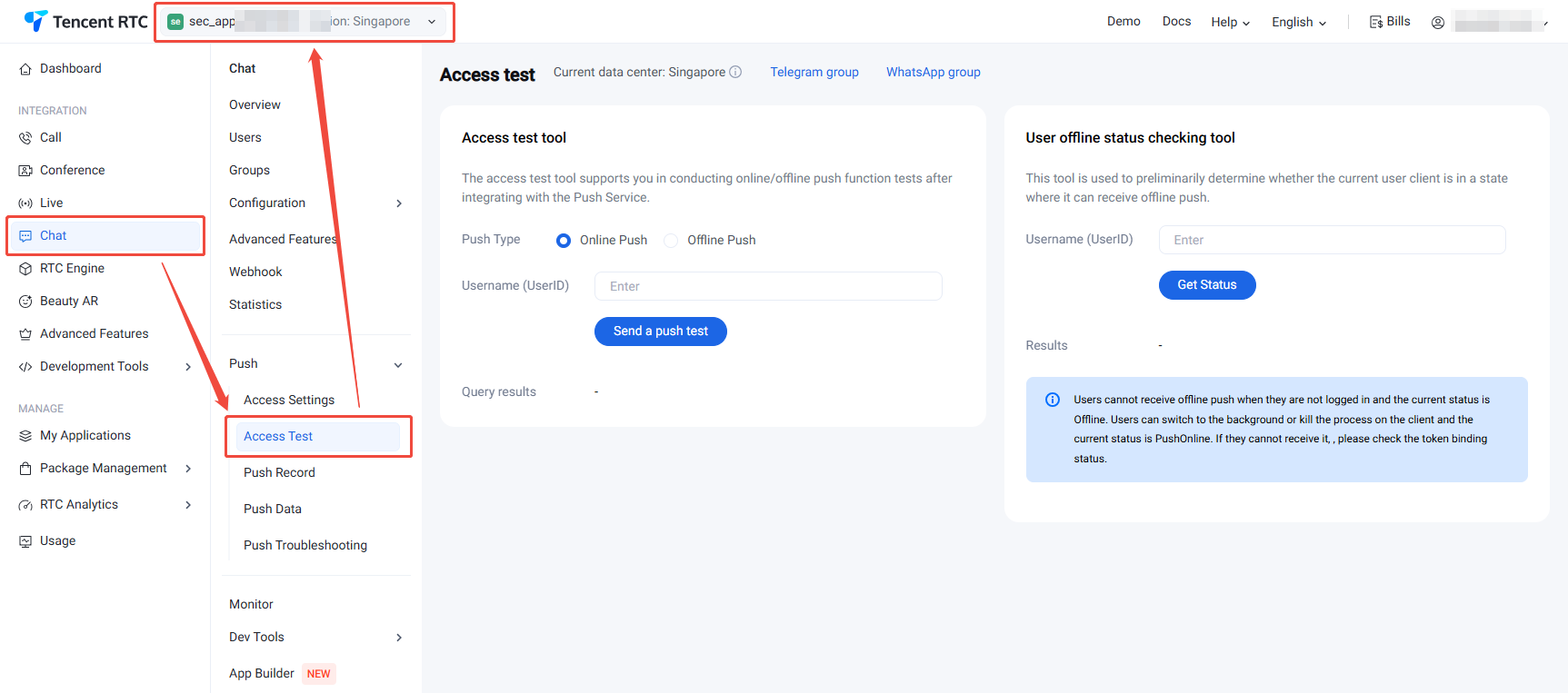 2. In the left sidebar, choose Chat > Push > Access test.