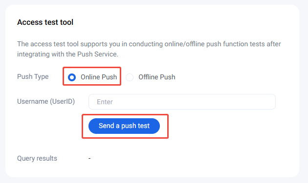 1. Log in to the Chat console, select Chat > Push > Access test in the left sidebar, and choose the target application at the top.