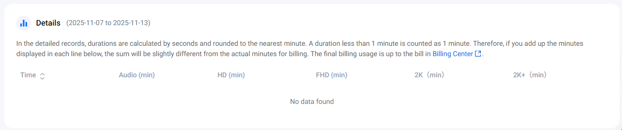 Durations are calculated in seconds and rounded up to minutes. Therefore, the cumulative duration used for billing may differ slightly from your actual usage. For the actual billable amount, see the bills generated in Billing Center.
