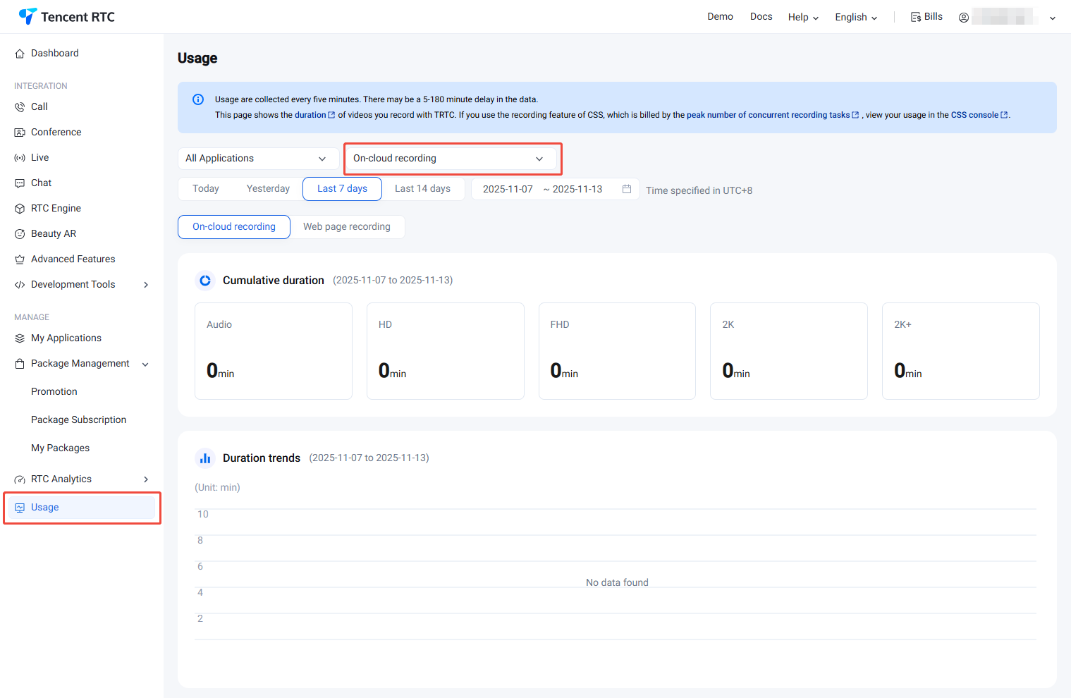 On-Cloud Recording usage statistics of the TRTC console are used to display details on the cloud recording usage of TRTC by recording duration. If you are using the recording concurrent peak route billing for CSS, you need to go to the CSS console to check.