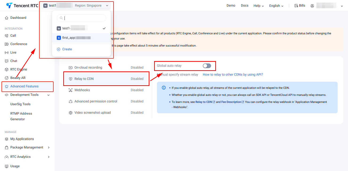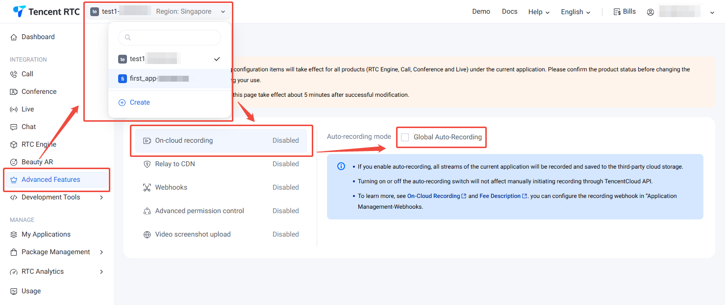 After an application is created, you can enable the Relay to CDN, On-Cloud Recording, and advanced rights control functions for your application through function configuration. The modification takes effect about 5 minutes after the modification.