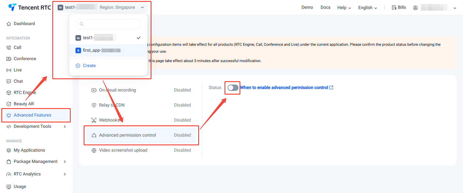 1. Enter Tencent RTC console > Advanced Features, select the target application in the top-left corner . Meanwhile, you can also click Create to quickly create a new application here.