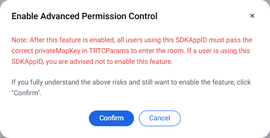 After advanced permission control is enabled, all users of the current SDKAppID need to pass the privateMapKey parameter correctly in TRTCParams in order to successfully enter the room. If there is a user using this SDKAppID online, do not enable this feature.