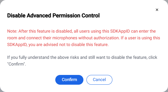 If you want to add room access restrictions or access restrictions to some rooms, that is, only allow specified users to enter the room or access the microphone, and you are worried that the client judge the permission is easy to encounter cracking attacks, then you can consider enabling advanced permission control.