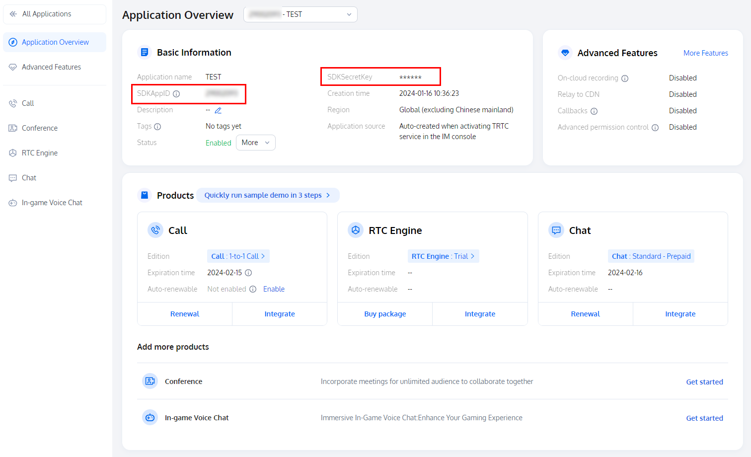 SDKAppID: TRTC application ID. If you haven't activated TRTC, log in to the TRTC console, create a TRTC application, click Application Info, SDKAppID information is as shown in the figure below: