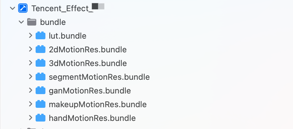 If your package includes dynamic effect and filter features, you need to download the corresponding resources from the SDK Download Page, After unzipping, import the bundles from the `resources/motionRes` folder into any directory of your main project as needed. After importing, it should look like the image below, where `lut.bundle` contains the filter resources and the others contain the animation resources.
