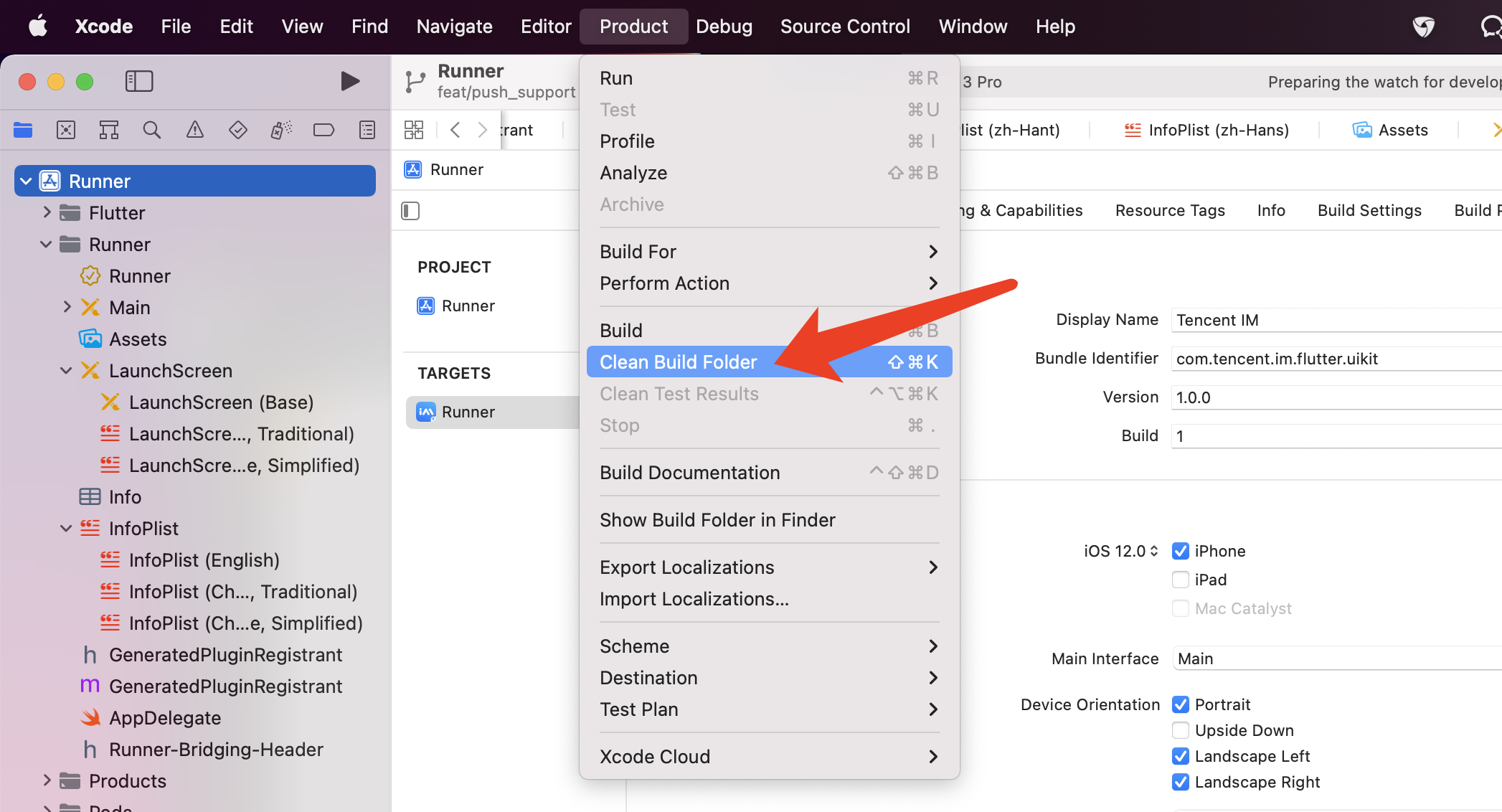 Solution 2: If you encounter errors after configuration and running, click Product > Clean Build Folder to clean the build artifacts, then rerun pod install or flutter run.