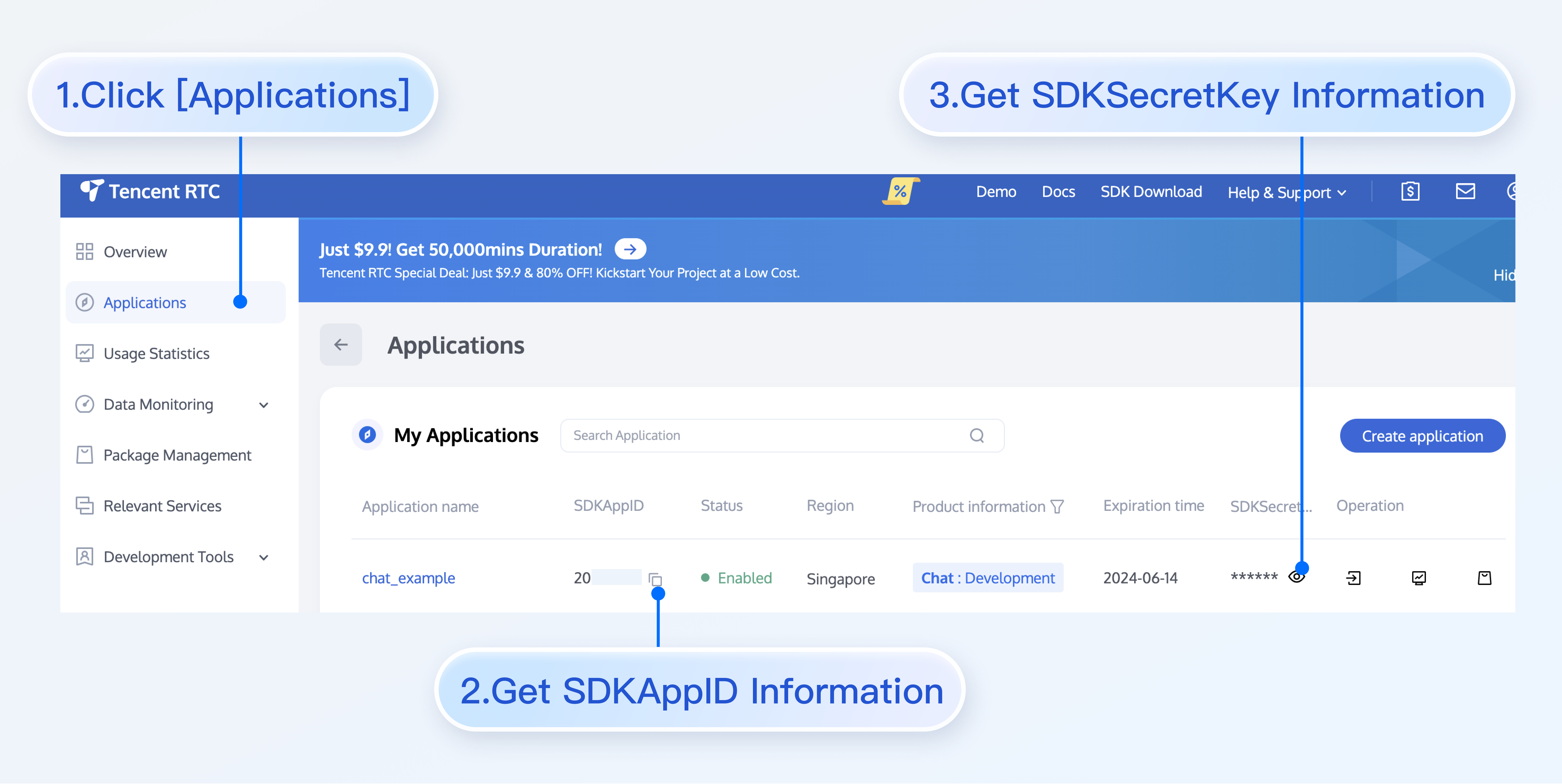 3. After creation, view your application's SDKAppID and SDKSecretKey on the console overview page. You will need both to run the demo.