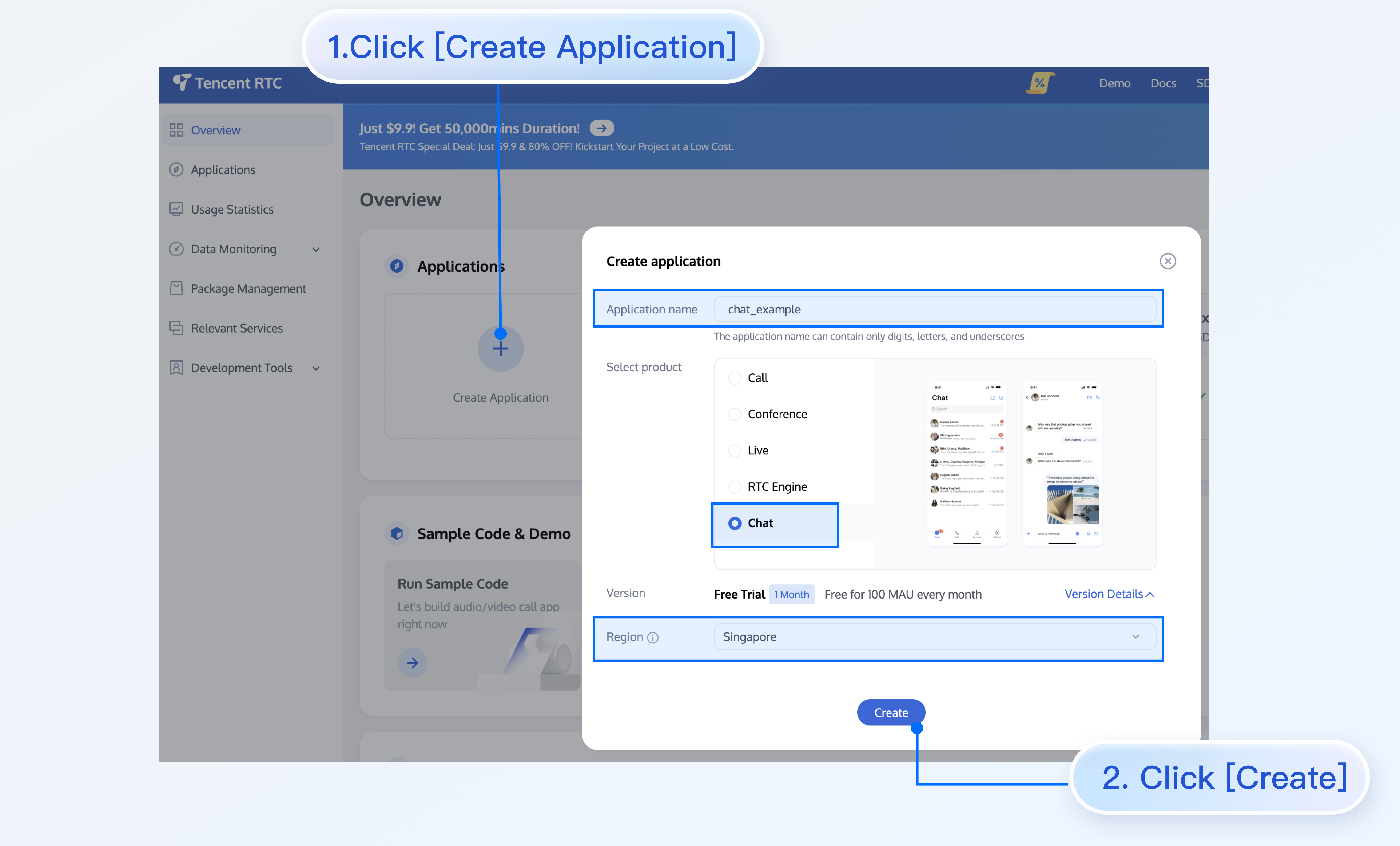 2. Click Create Application, enter your application name, select the product and region, then click Create to complete the process.