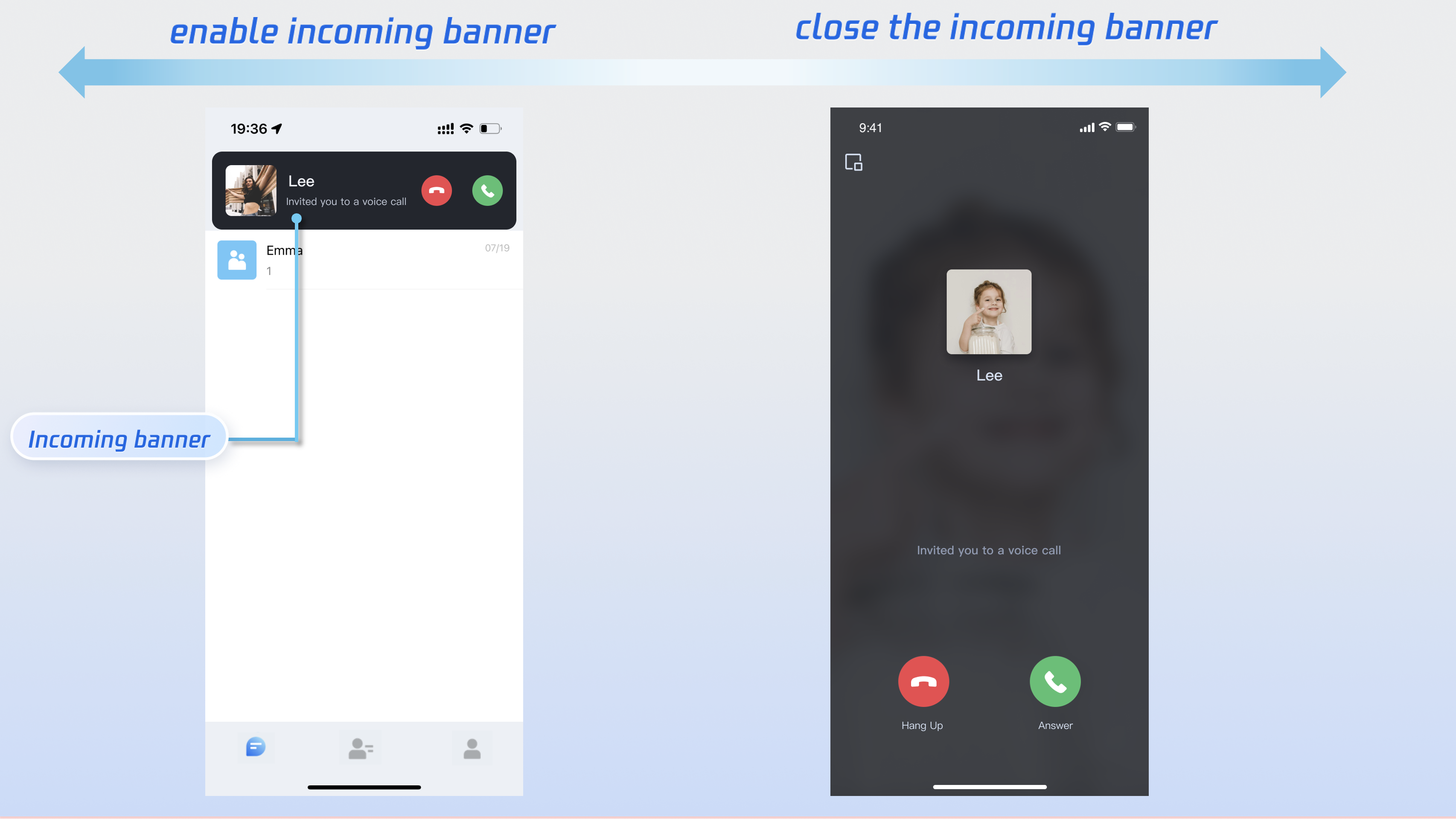 enableIncomingBanner API: by default (disabled), the callee will immediately display the full-screen call interface upon receiving an invitation, while enabling it will show a notification banner first, followed by launching the full-screen call interface as required.