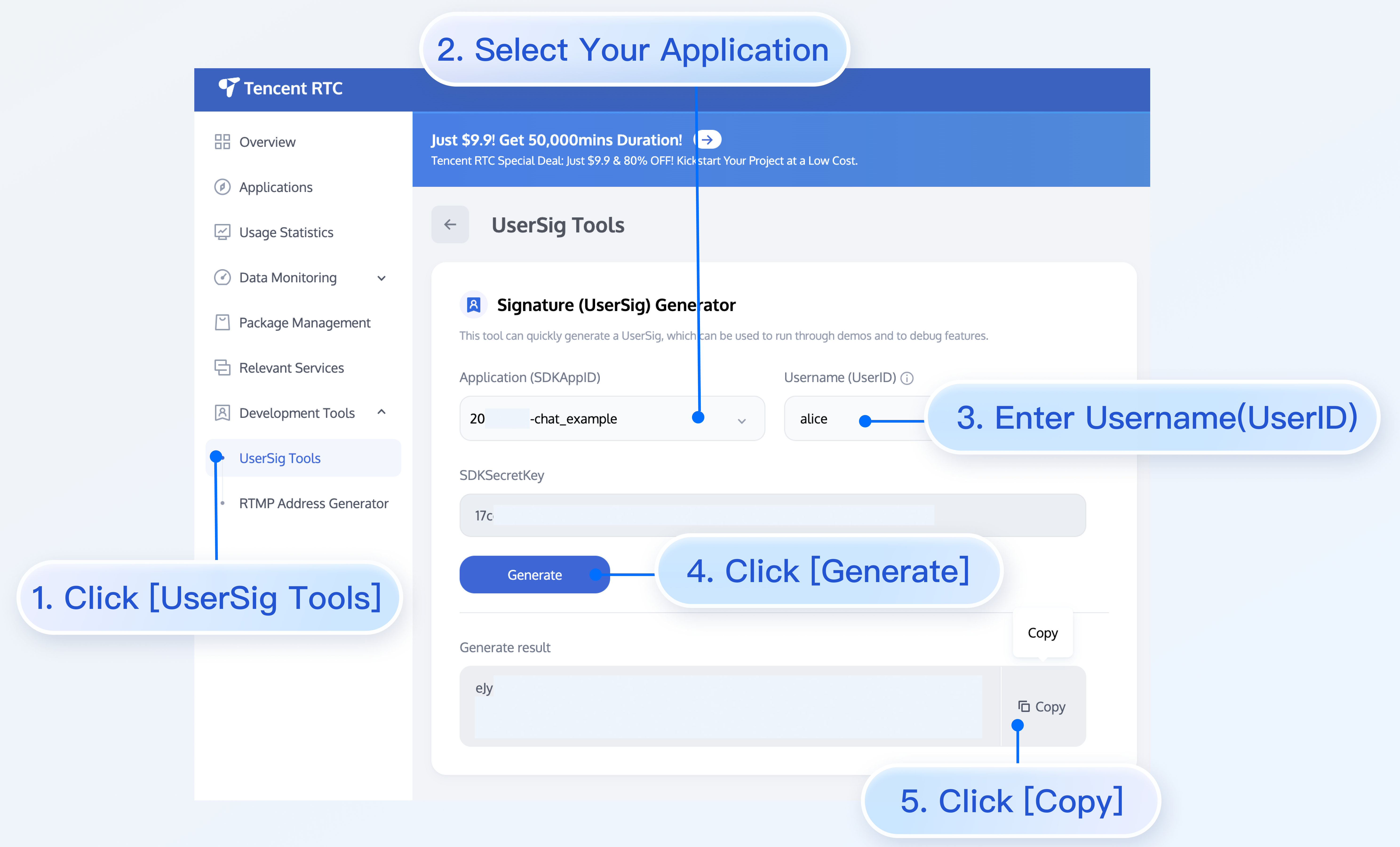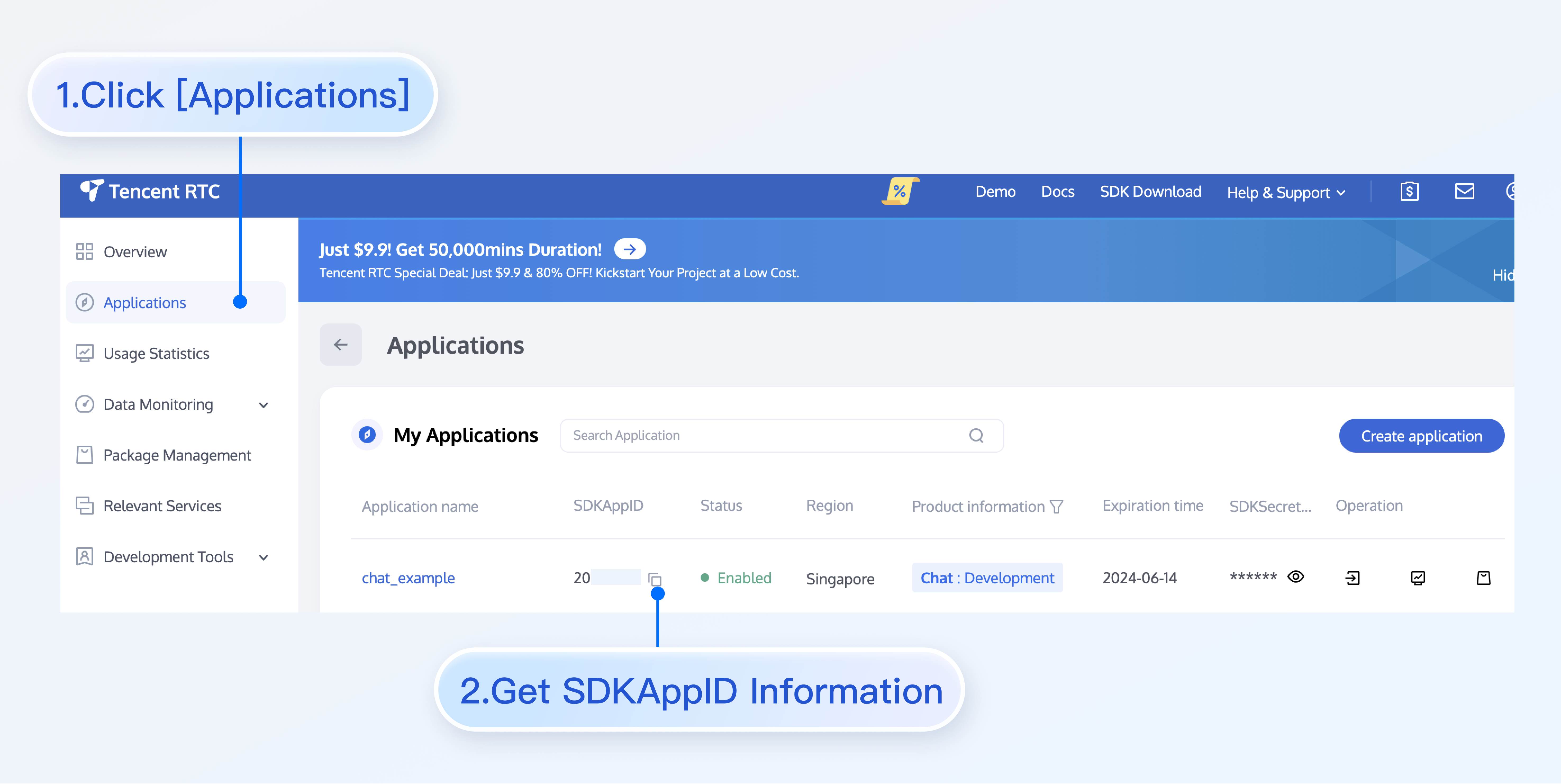 Step 4: Gain access to SDKAppID, secretKey, and userID