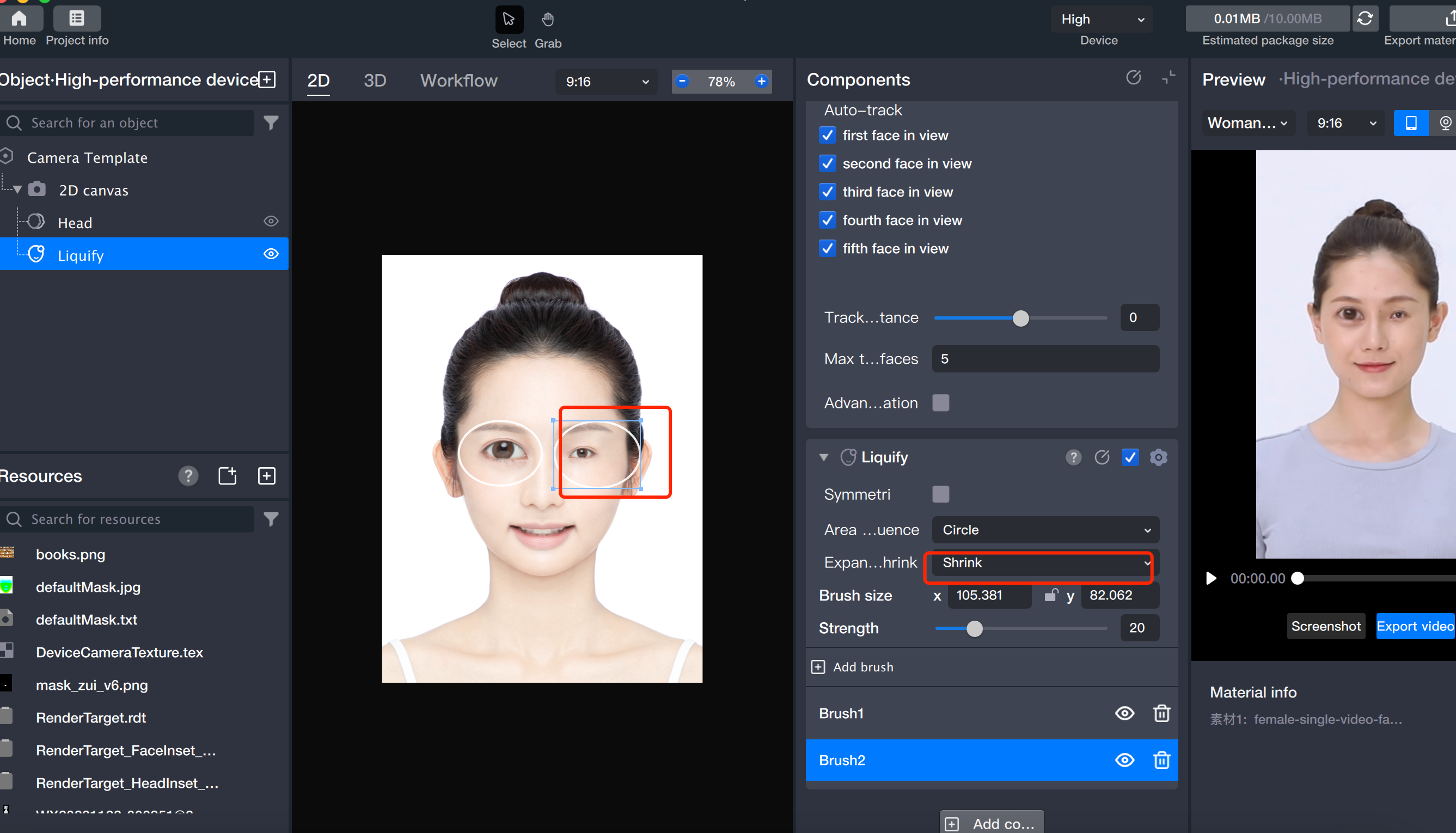 Brush Scaling: Resize the brush directly in the Scene panel by dragging its edge—drag outward to increase size, drag inward to decrease size. You can also adjust brush size in the Face Liquify component. Click the center lock button to maintain the aspect ratio for proportional scaling.