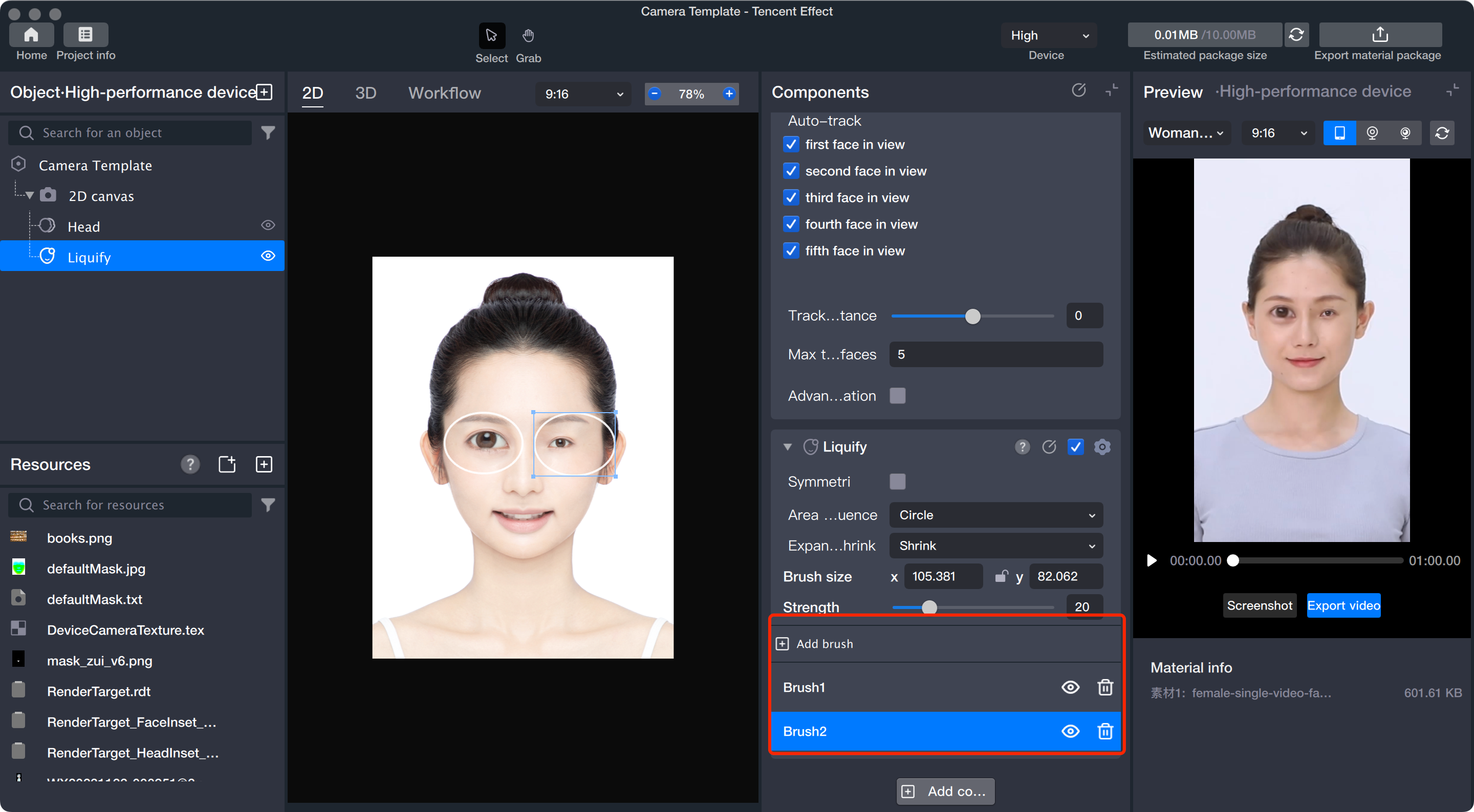 Add Multiple Brushes: The Face Liquify tool allows you to add multiple brushes within the same component. All brushes simultaneously deform the face, and overlapping regions will combine their effects.
