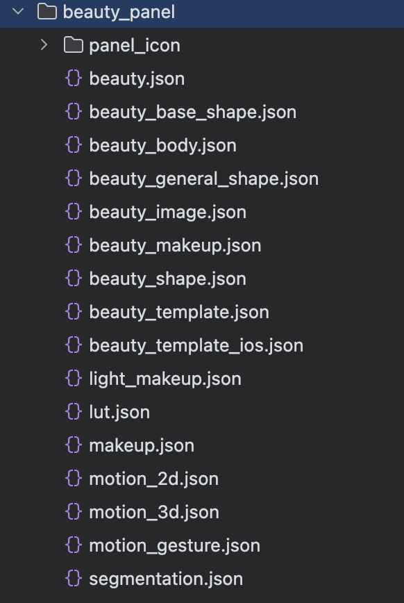 Obtain the panel configuration file from the demo project's demo/src/main/assets/beauty_panel, or click here to download and unzip it. The file includes configurations for beauty, body beauty, filters, dynamic effect stickers, and segmentation properties. Select a set of JSON files according to your package type and place them in the assets/beauty_panel folder in your project (the panel_icon folder also needs to be placed in this directory).