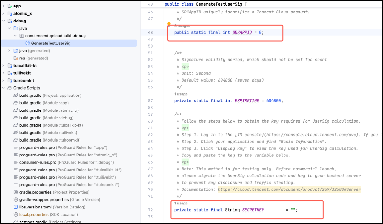 application/debug/src/main/java/com/tencent/qcloud/tuikit/debug/GenerateTestUserSig.javafile, and fill in the SDKAppID and SDKSecretKey obtained during Activate the Service: