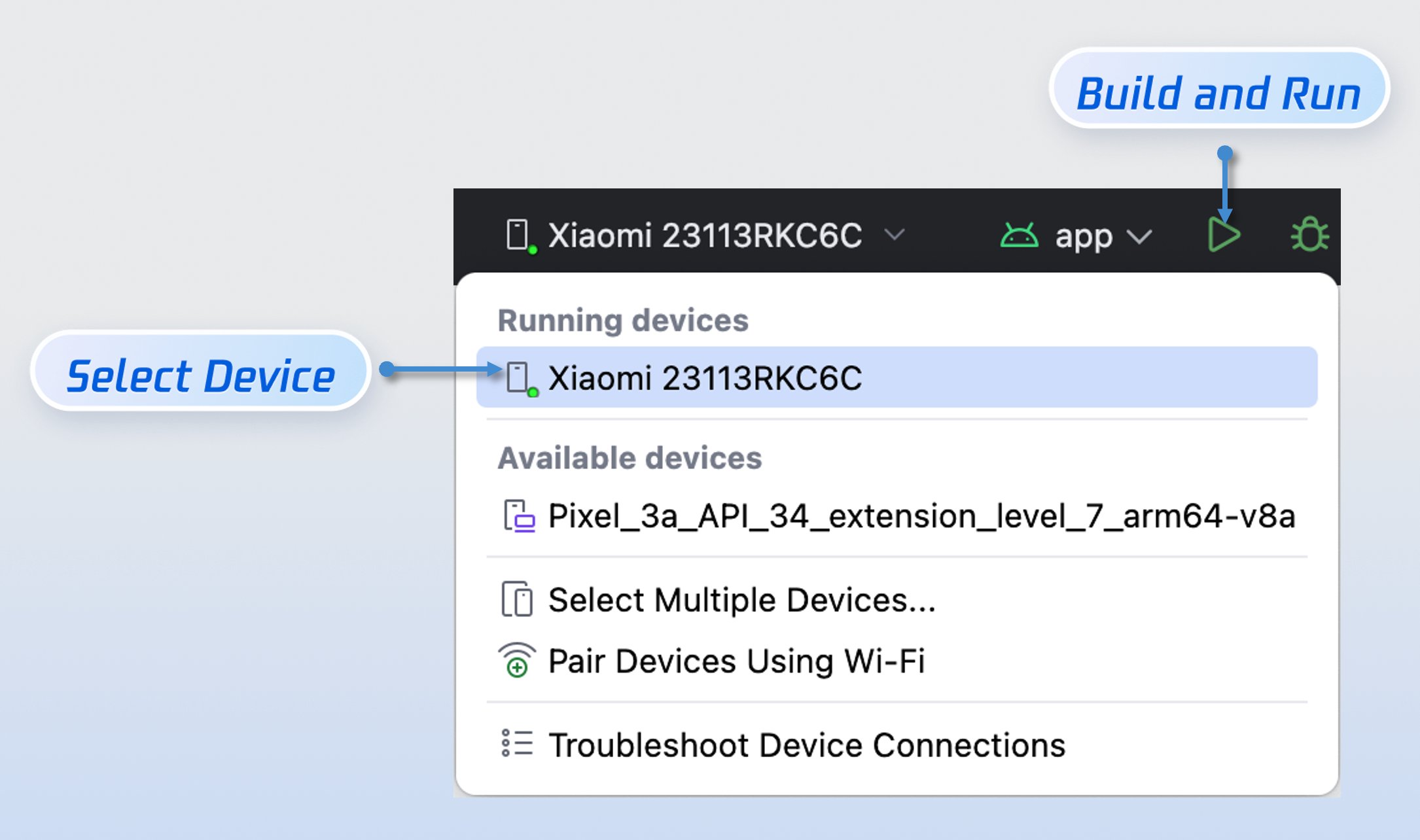 Run the program through Android Studio. Log in with two different user accounts on two devices,one as the caller and one as the callee, to complete an audio/video call experience.