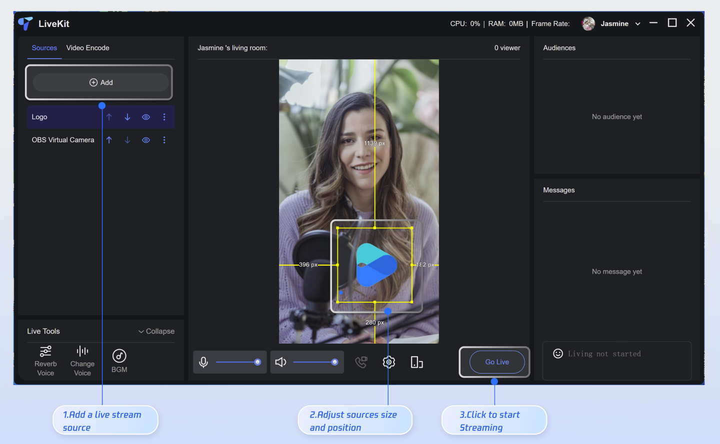 After launching the demo, follow these steps to enrich your live stream and start broadcasting: