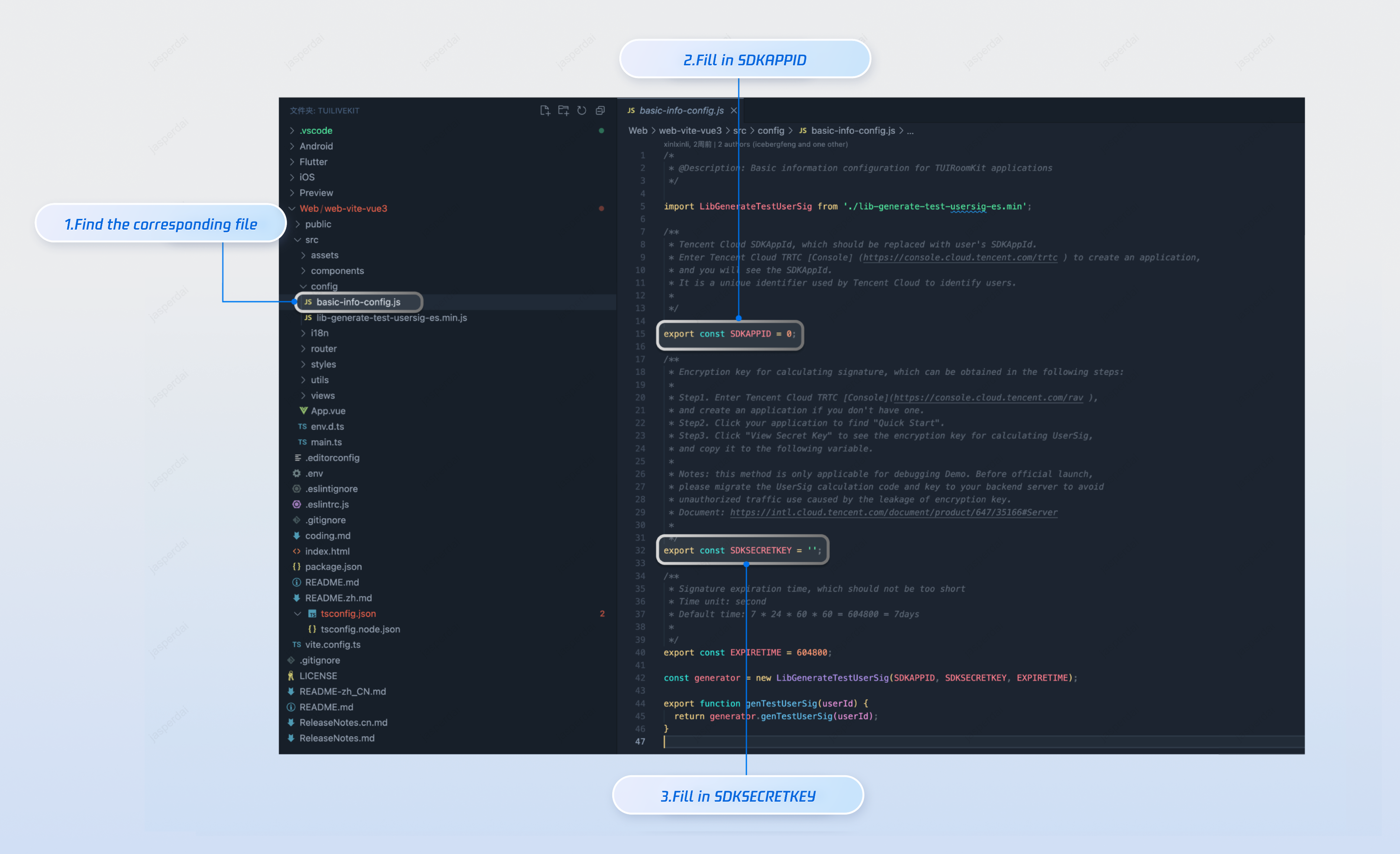 SDKAppID: Required application identifier. Used by Tencent Cloud for billing and analytics.SDKSecretKey: Application secret key. Used to initialize the configuration file with key information.Environment Preparation