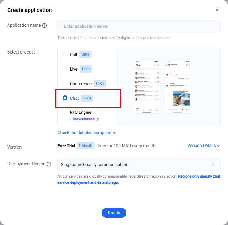 2. Enter the application name in the create pop-up window and choose Chat, select the appropriate Deployment Region, then click Create.