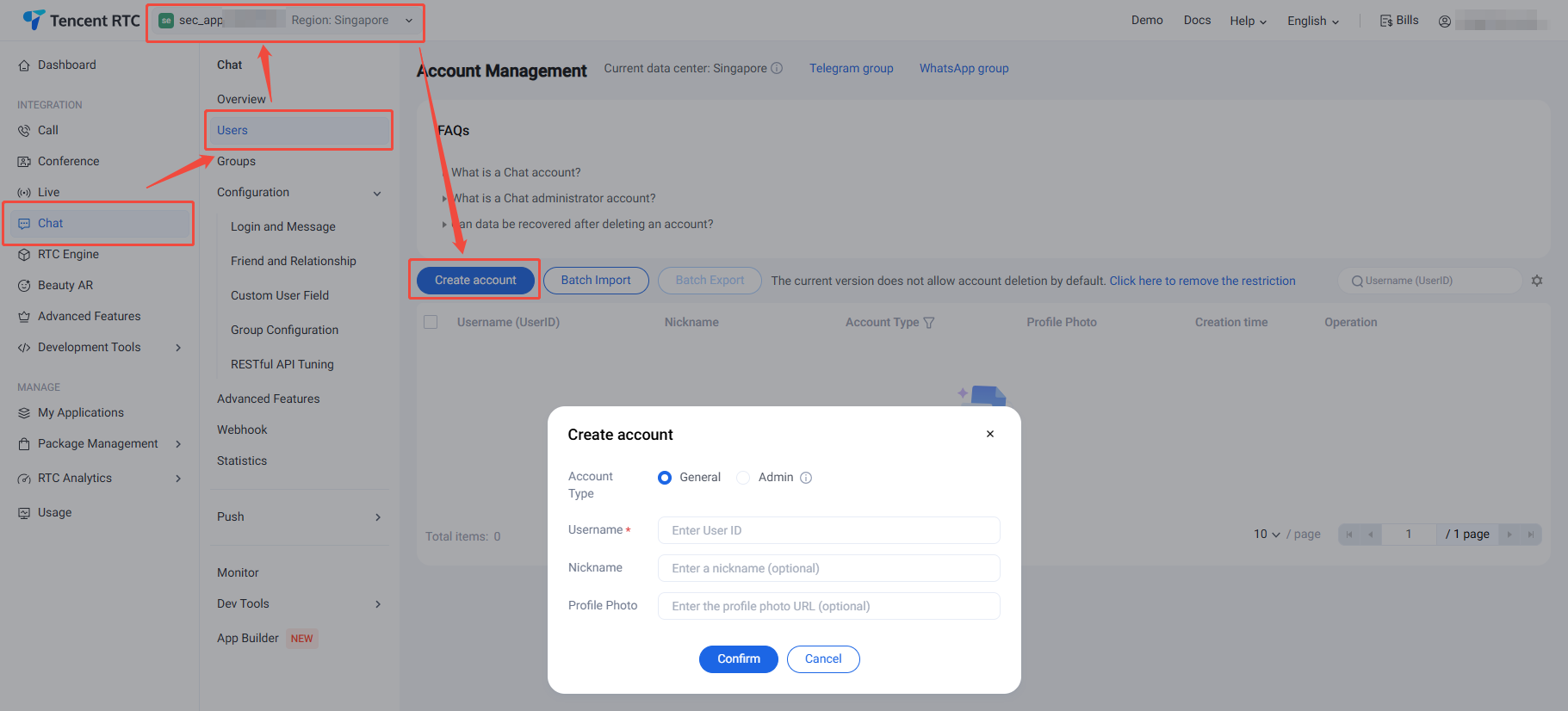 A Tencent Cloud account can create a maximum of 300 Chat apps. If you want to create a new app, disable and delete an unwanted app first. Once an app (along with its SDKAppID) is deleted, the service it provides and all its data are lost. Proceed with caution.