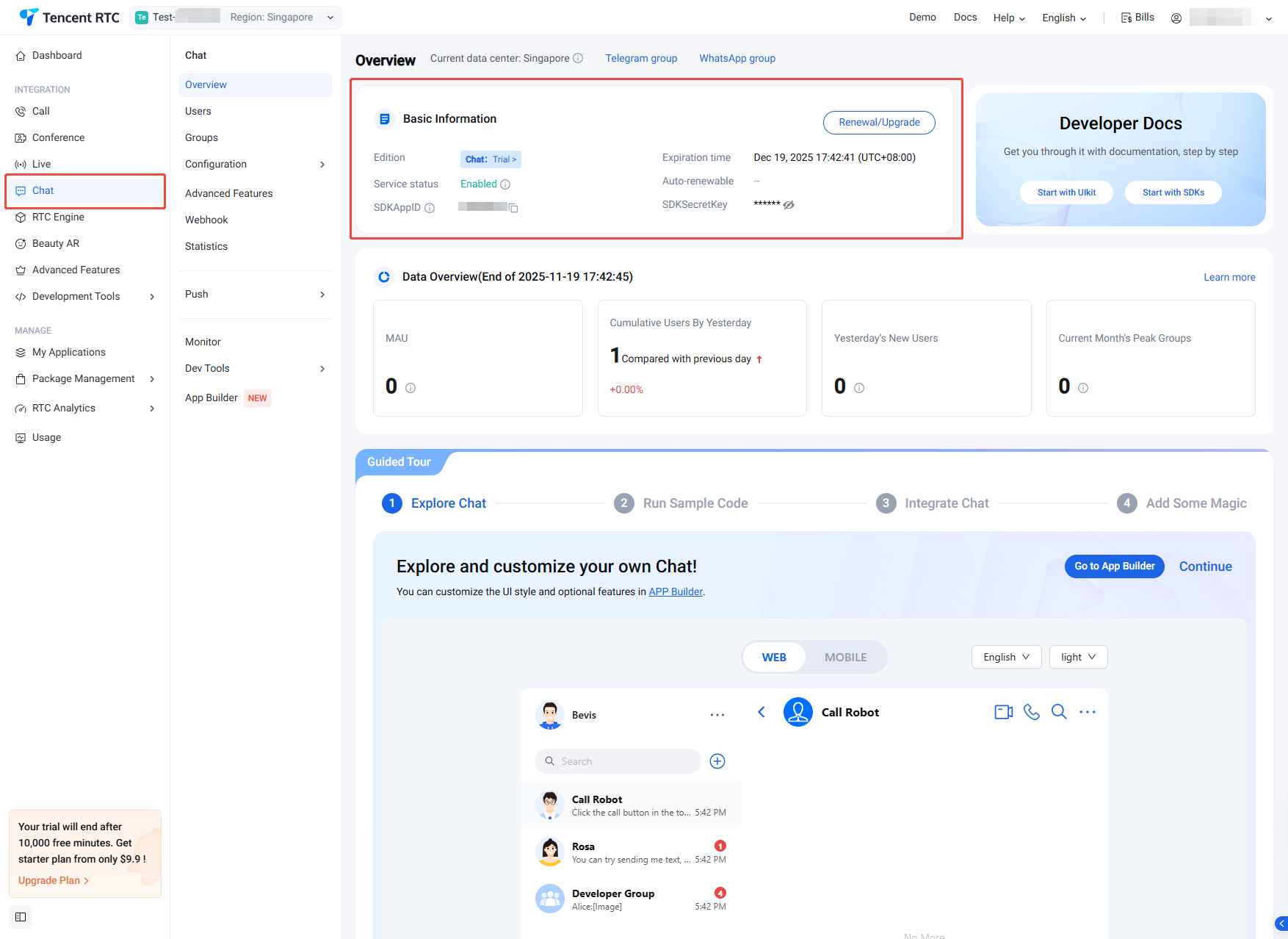 3. Upon creation, you can view the status, business version, SDKAppID, SDKSecretKey, creation time, and expiration time of the newly created application on the current Chat Product Details Page or My Applications.