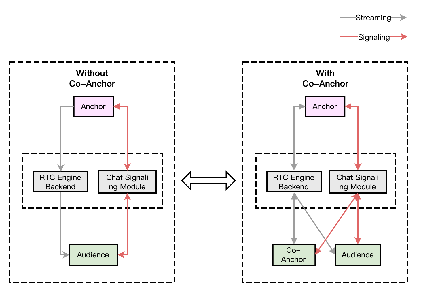 1. Both the anchor and audience connect through the signaling module, which is mainly responsible for controlling the live streaming process and synchronizing the live streaming status.