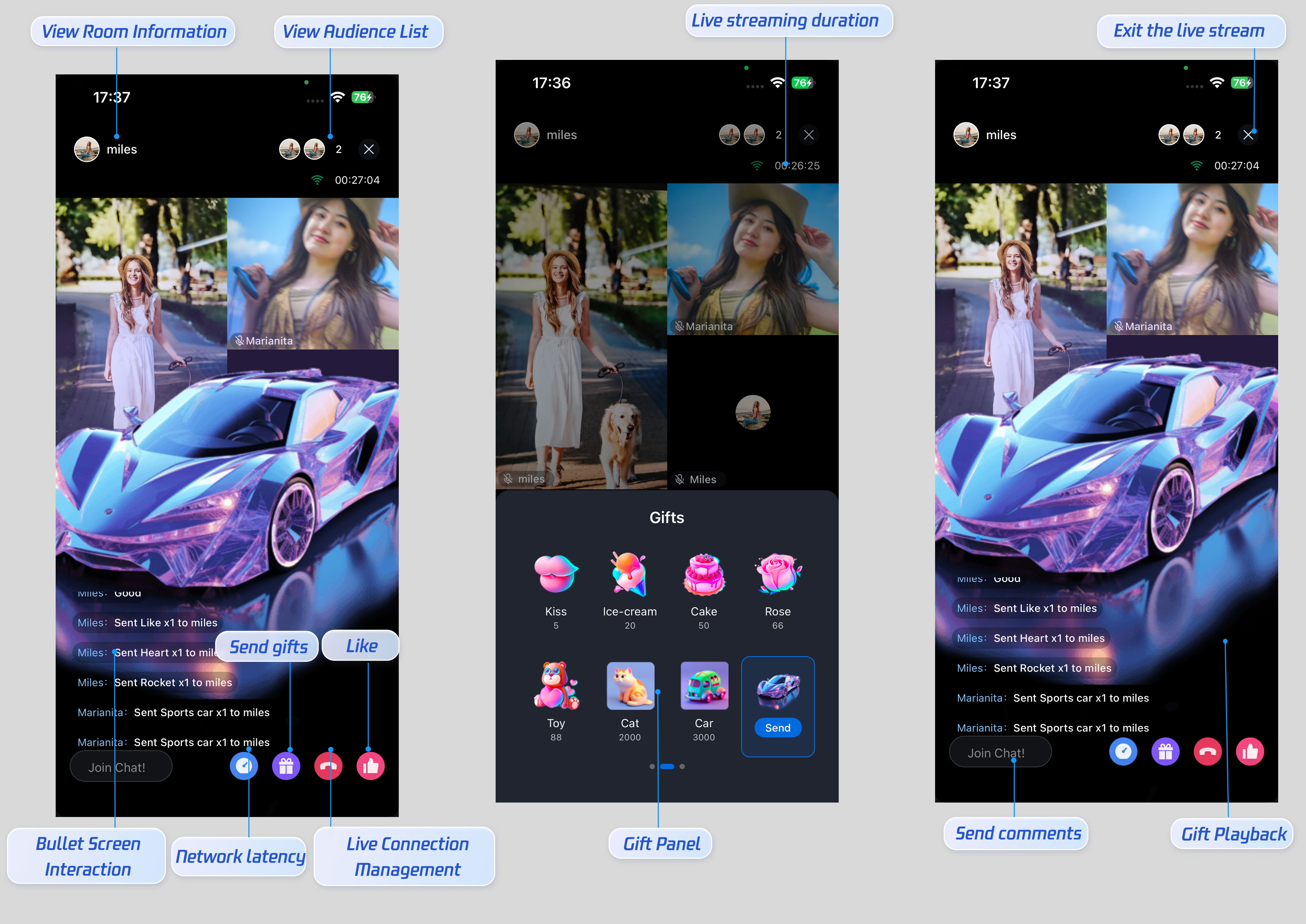 This guide walks you through integrating the audience viewing page, enabling users to watch a host’s live stream, join as co-hosts, view live room details, check the online audience, send gifts, like streams, and interact via live comments.