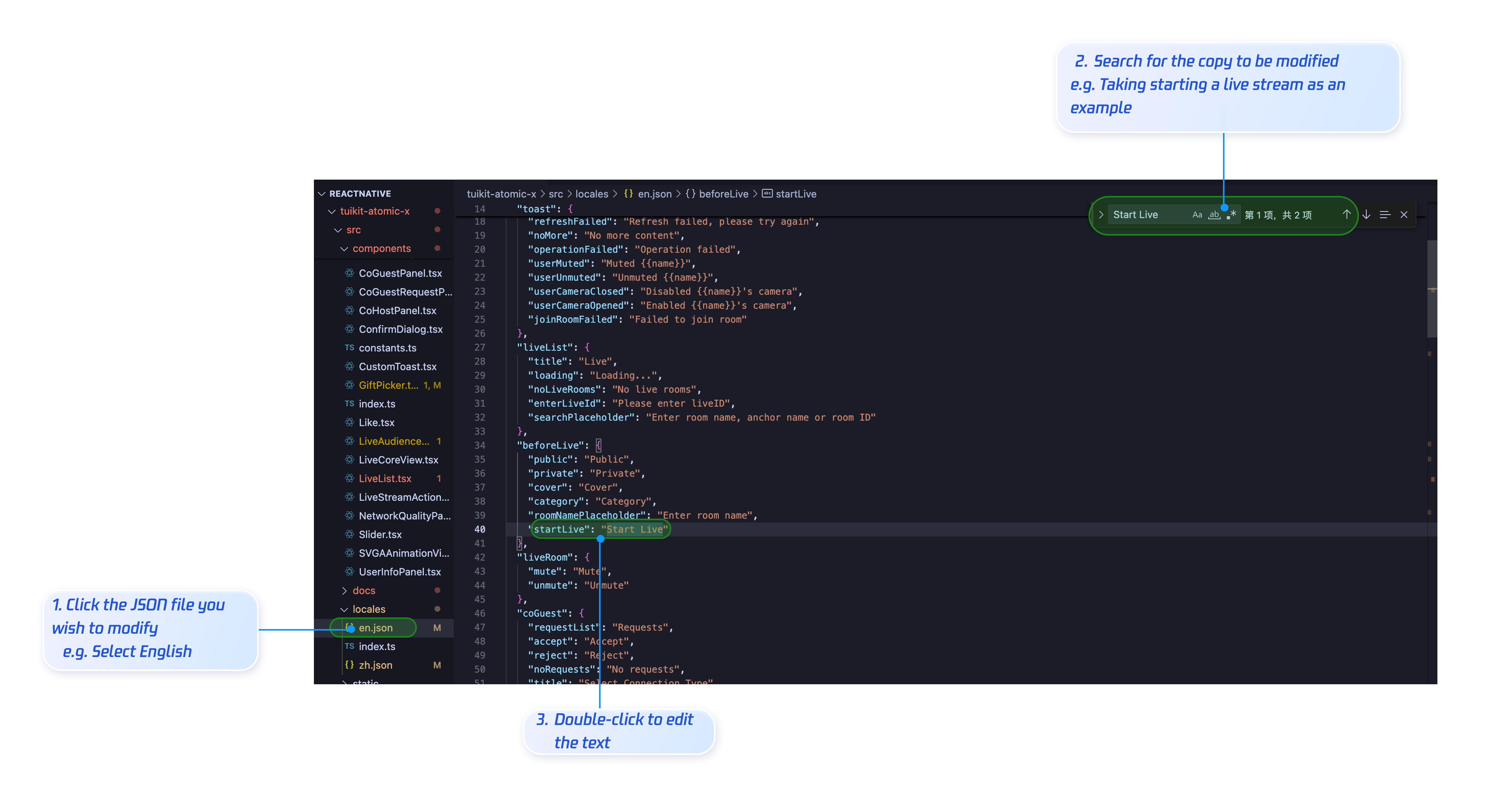 All UI text in TUILiveKit is managed in a centralized location. To update any text, edit the relevant json files in the tuikit-atomic-x/src/locales/ directory.