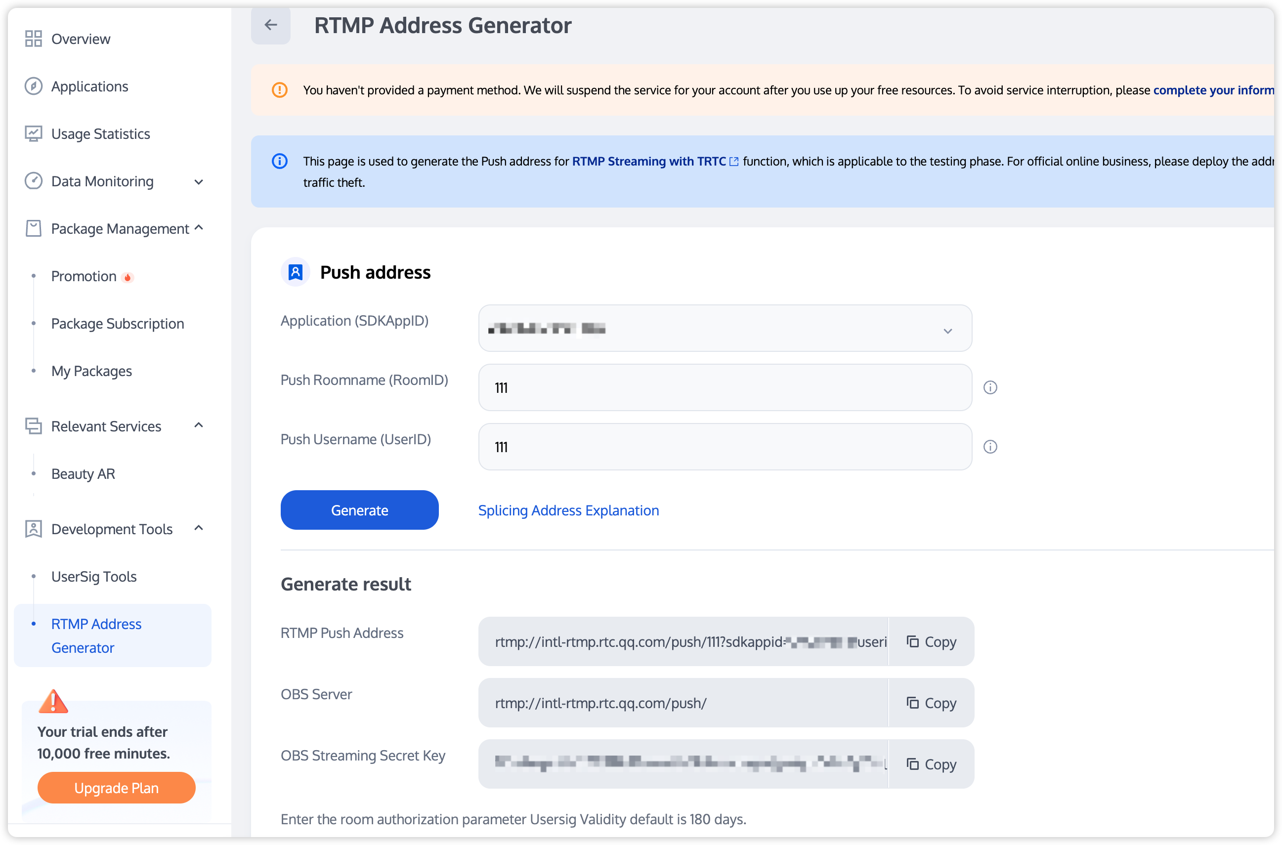 It is recommended to create two separate applications for the test environment and the production environment. The first activation of RTC Engine includes a free 10,000-minute trial package.