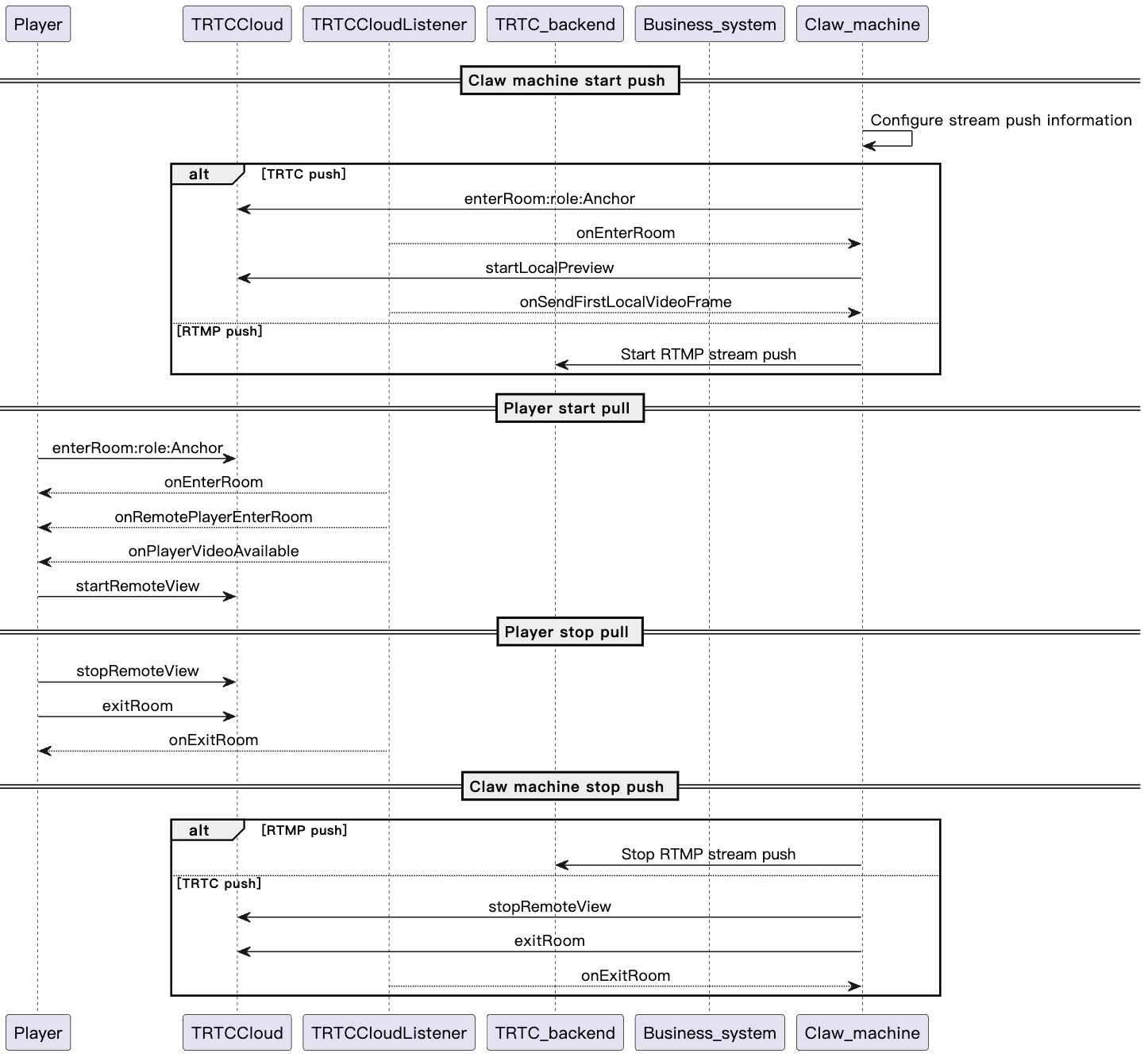 The diagram below illustrates the sequence of RTC Engine streaming for an online claw machine, including processes such as RTC Engine streaming from a network camera and user-side stream pulling.