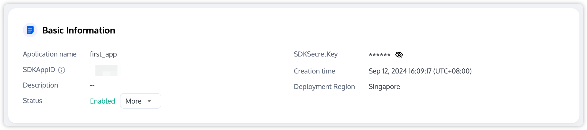 2. After creating the application, you can view its basic information in Application Management > Application Overview. Keep your SDKAppID and SDKSecretKey secure for future use, and take precautions to prevent key leakage that may result in unauthorized traffic usage.