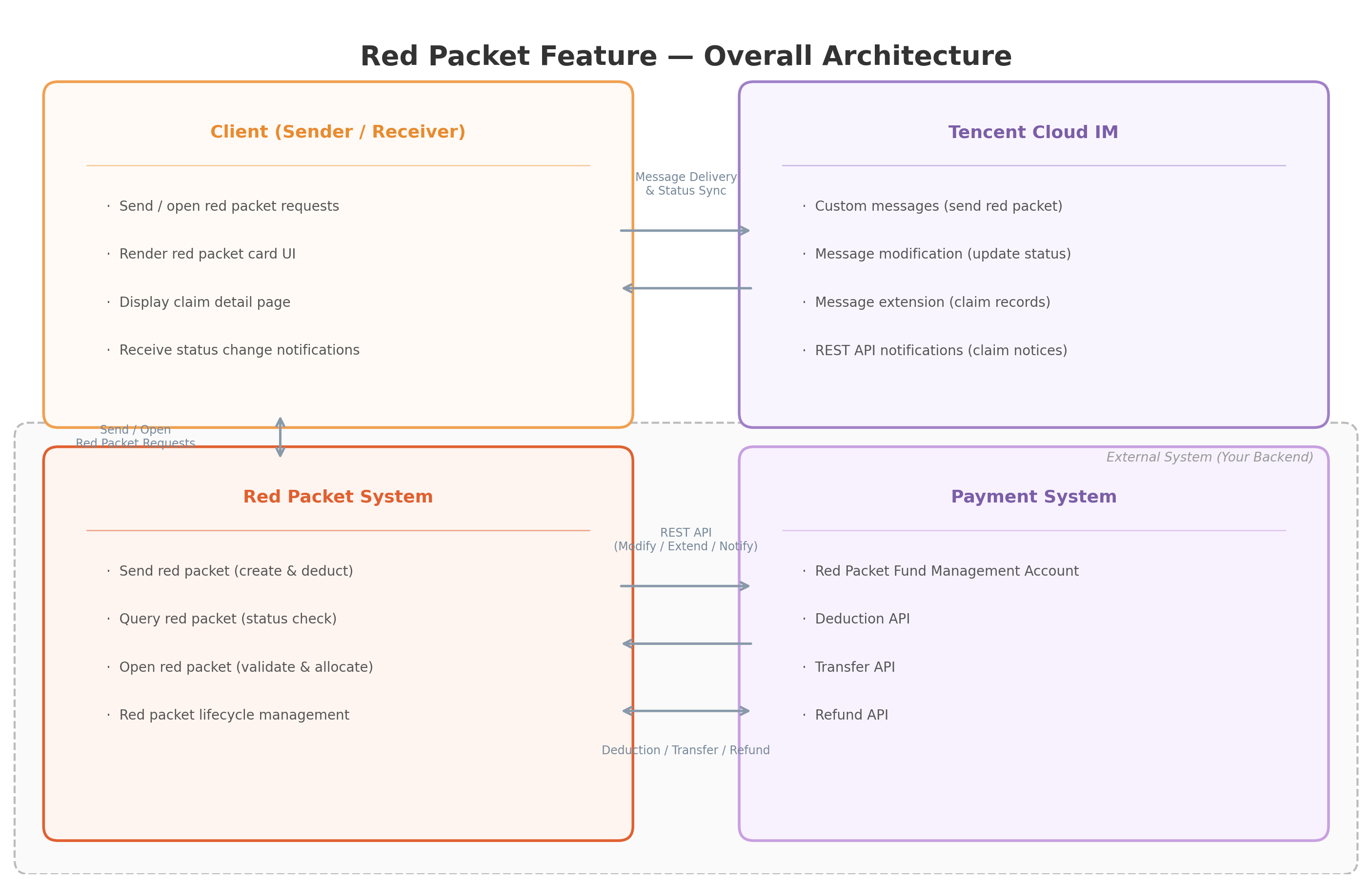The solution leverages Chat Custom Messages, Message Modification, and Message Extension Data, and integrates with an external Payment System and Red Packet System to support the end-to-end workflow: sending, claiming, status synchronization, and notifications.