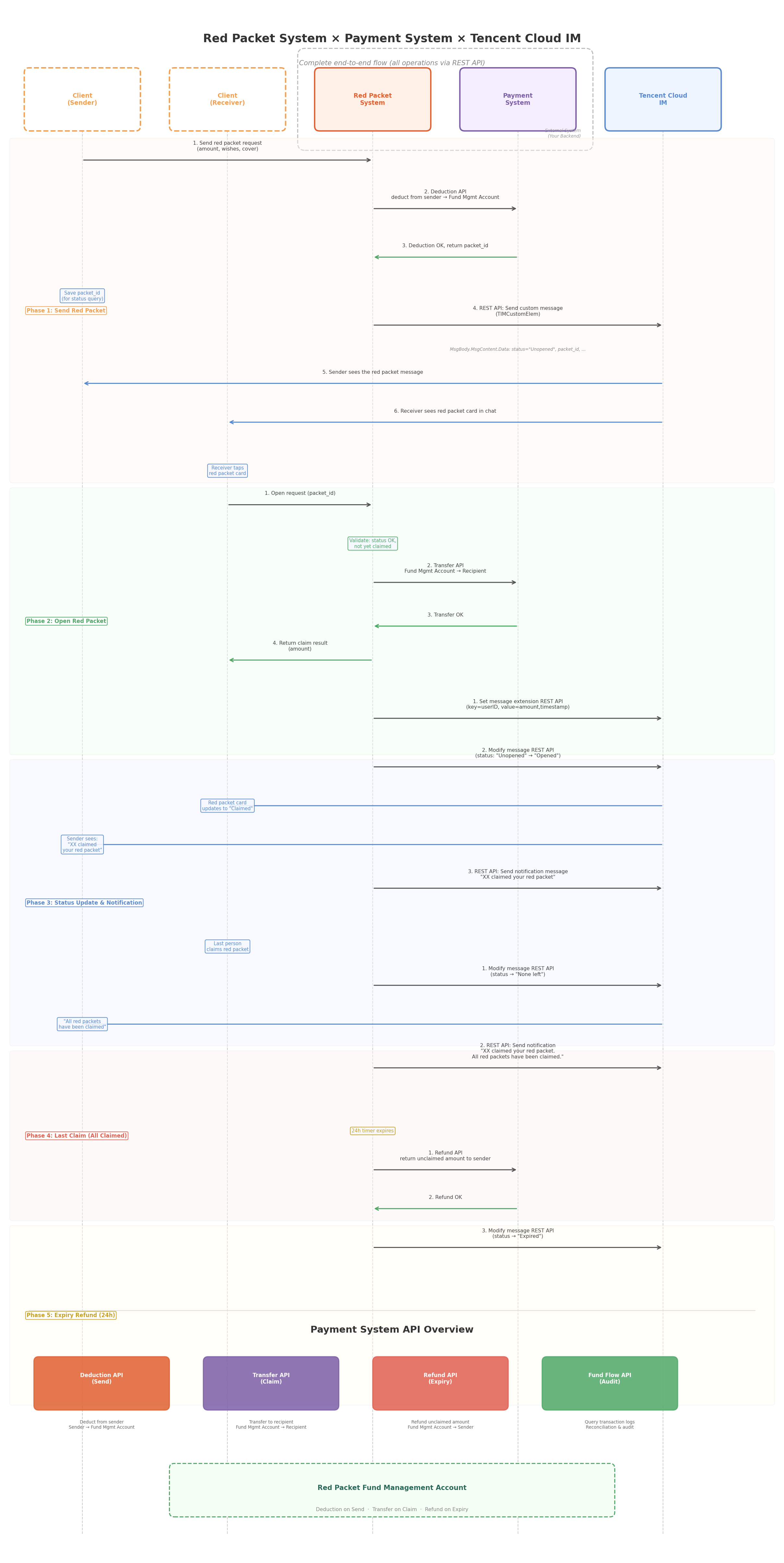 All message modification, extension data updates, and notifications are handled by the Red Packet System server via REST API. Group chat uses dedicated group APIs with GroupId + MsgSeq parameters. Status transitions include "None left".