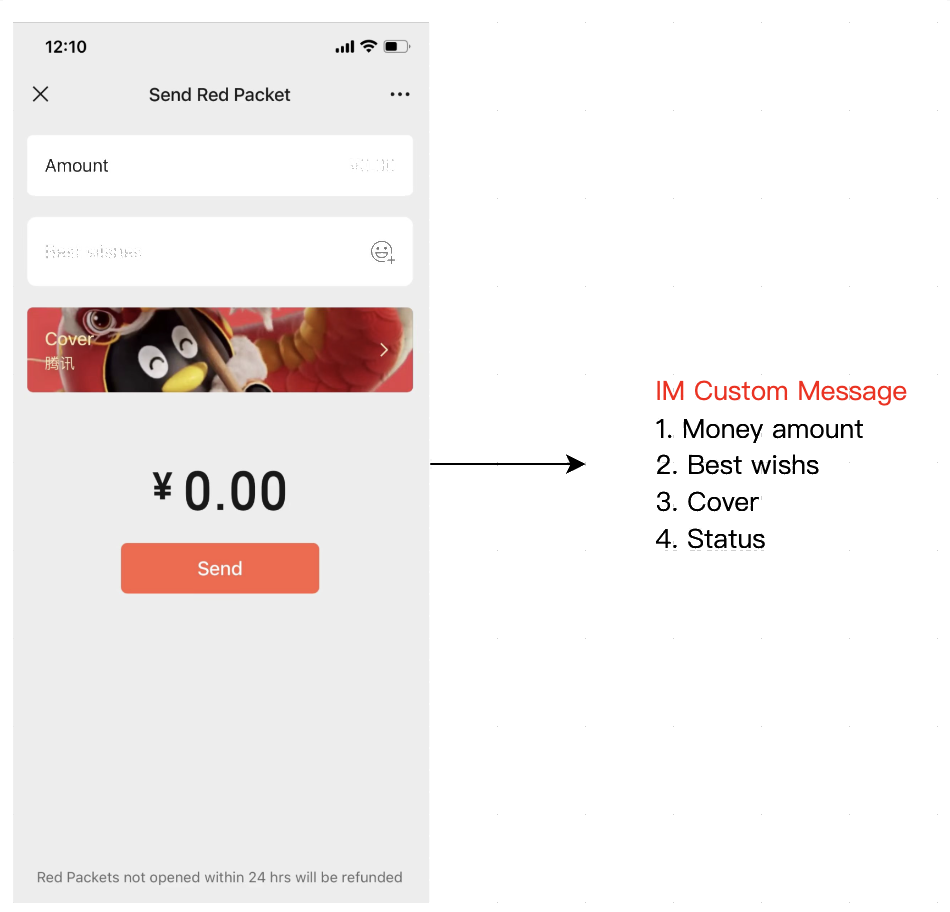 The sender taps the red packet entry in chat, enters the amount and greeting message, and optionally selects a cover image. These fields map directly to the custom message payload.