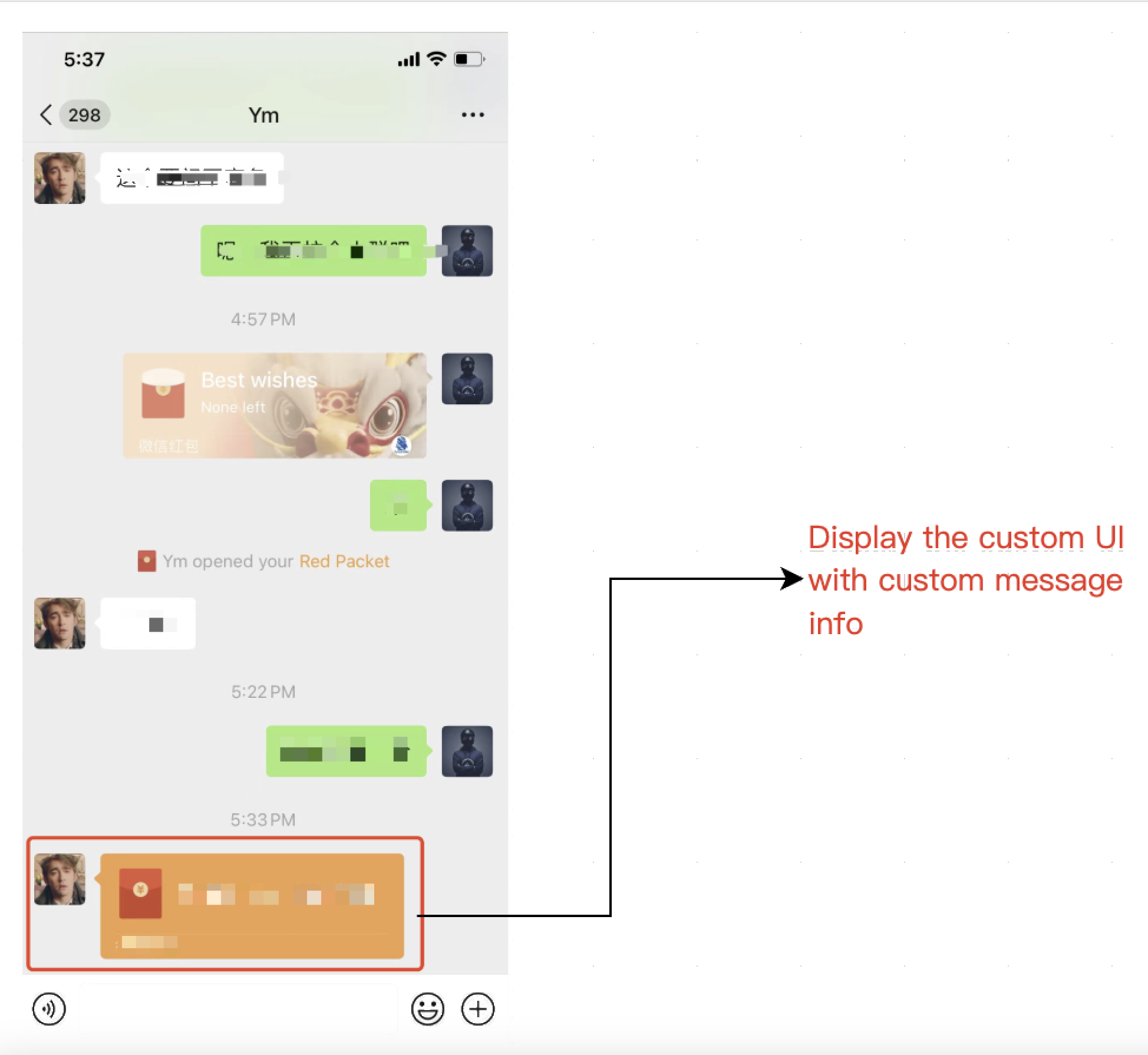The red packet appears as a custom card in the chat list. The receiver can tap the card to claim the red packet. After claiming, a notification appears in the chat.