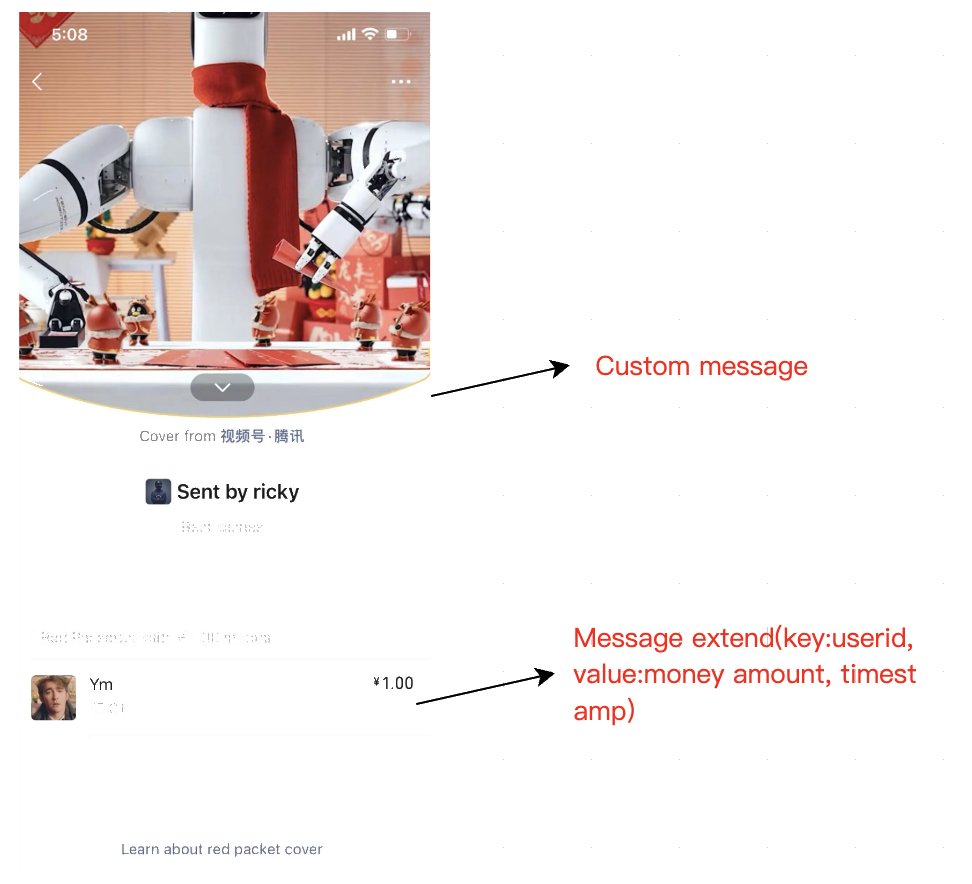 Red packets are implemented as Chat Custom Messages. The payload includes the following fields: