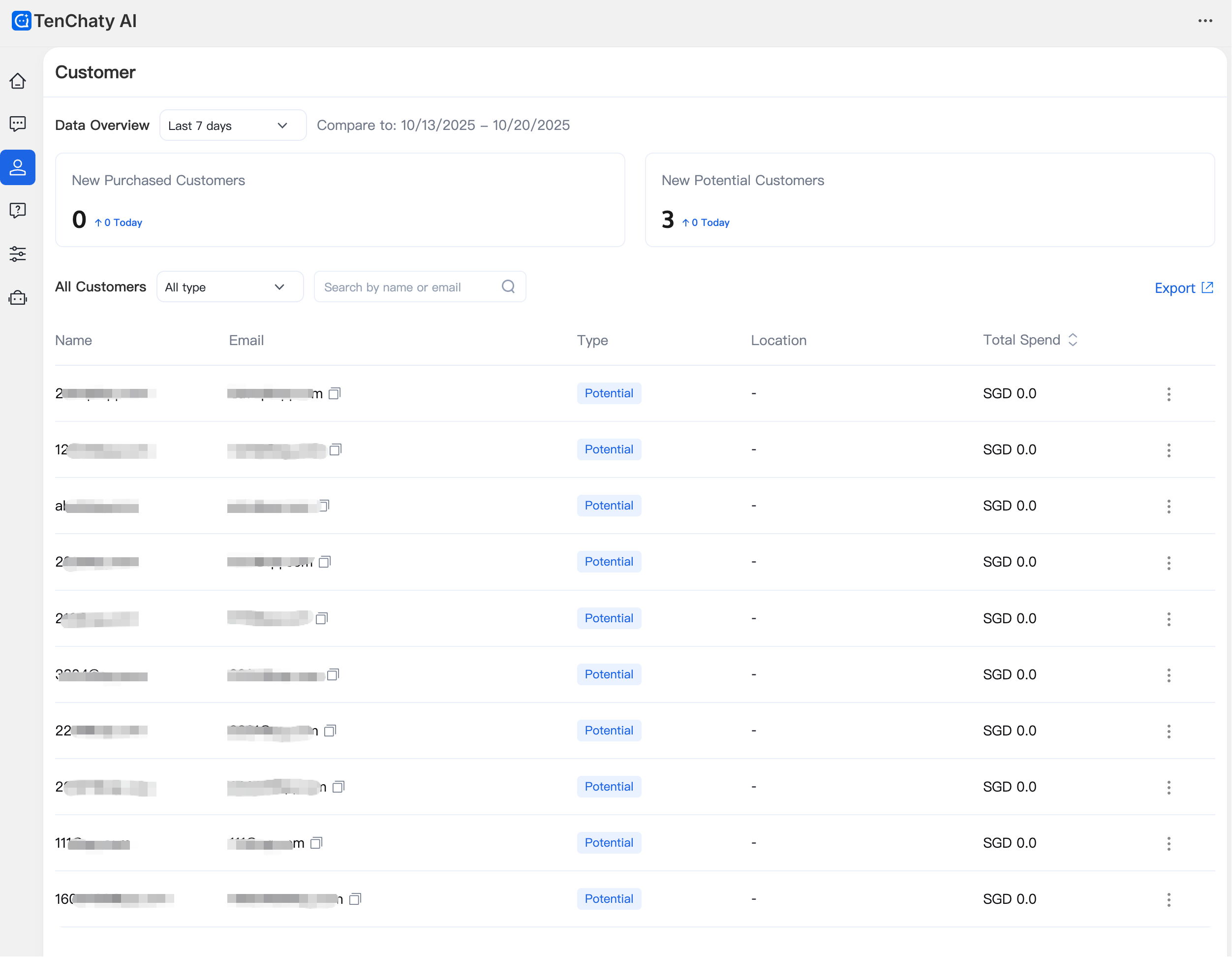 You can view and manage customer information on the Customer page. This includes monitoring the number of newly added paying customers and potential customers, as well as viewing details such as name and email.