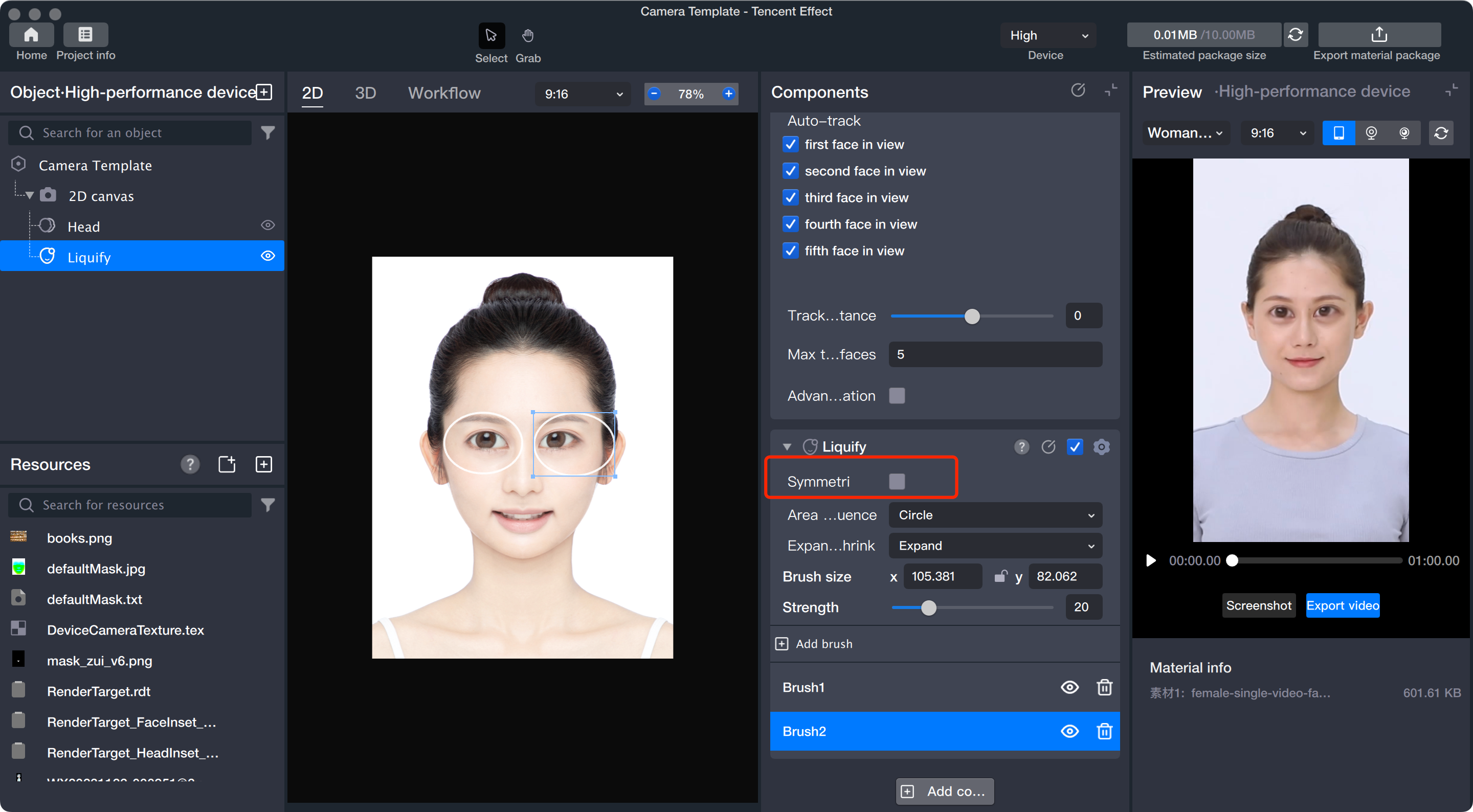ブラシの追加:顔液化ツールでは、1つのコンポーネント内で複数のブラシを同時に配置できます。各ブラシがそれぞれ顔の変形を加え、重なった部分では変形効果が合成されます。