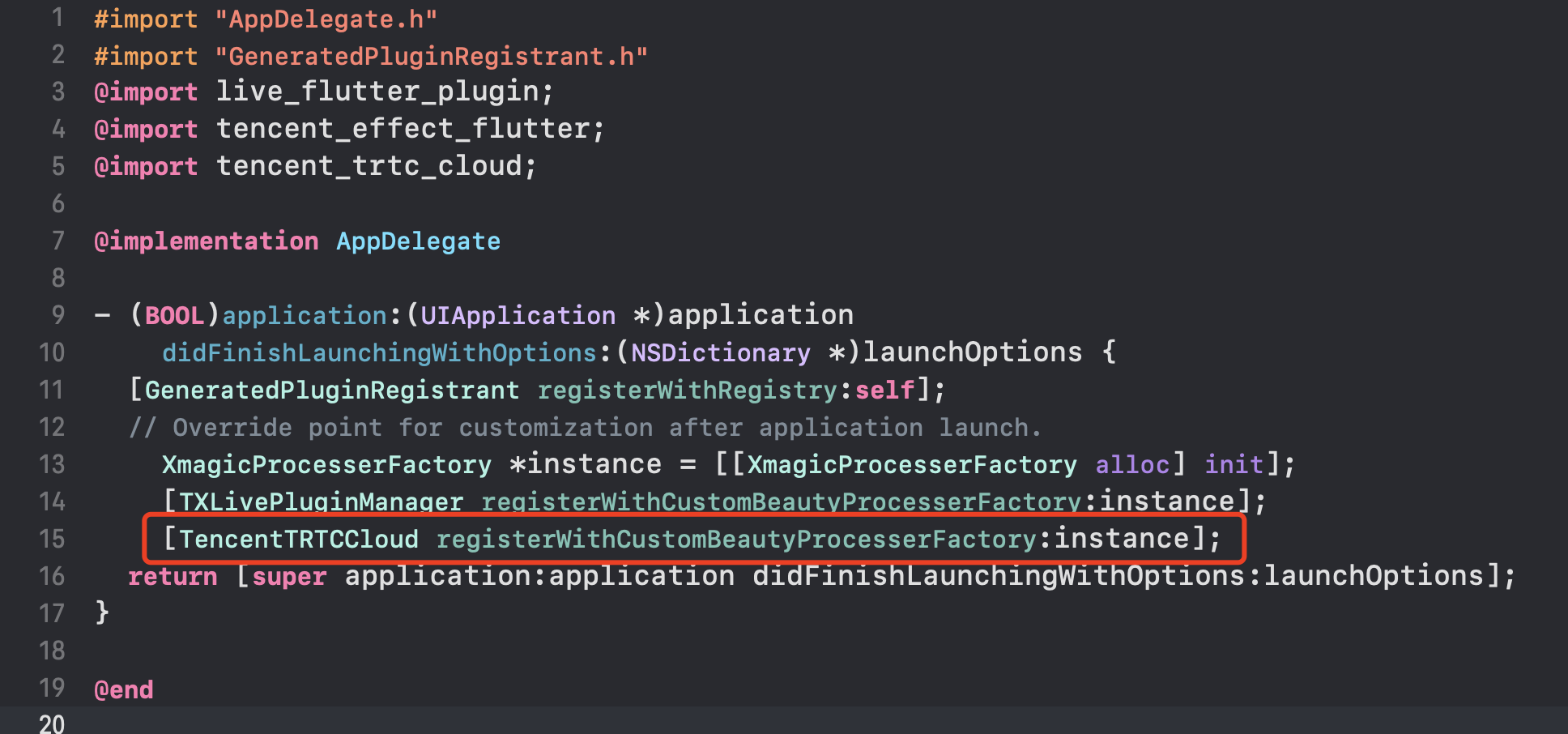 1. TRTC provides a method of registration. During application startup, the implementation class com.tencent.effect.tencent_effect_flutter.XmagicProcesserFactory of the beauty effect ITXCustomBeautyProcesserFactory API needs to be registered into TRTC (perform on the native end).