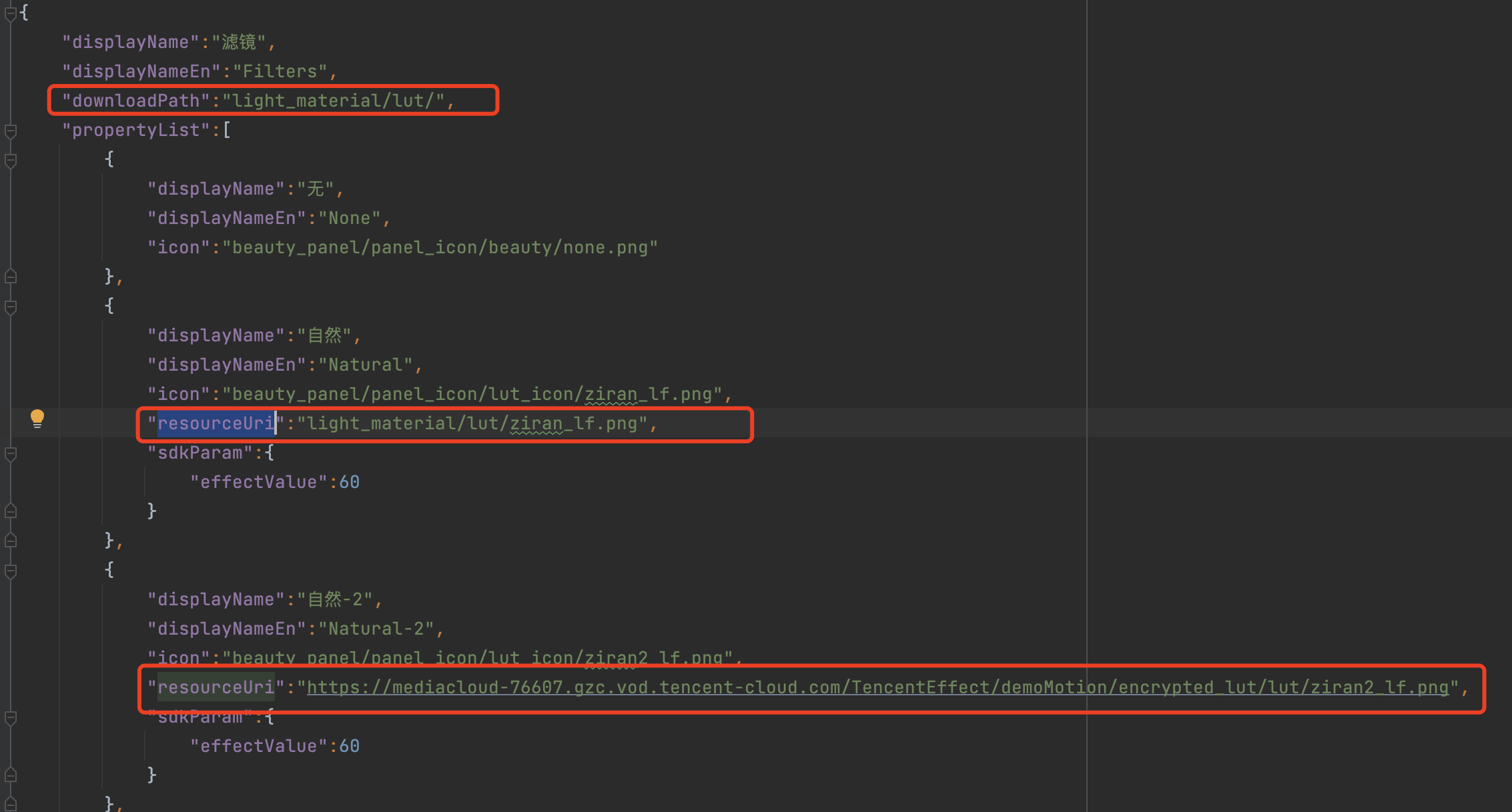 Since the configuration of Filters, Animated Stickers and Segmentation is primarily identical, the JSON for filters is used here for illustration. The fields downloadPath and resourceUri are added here.