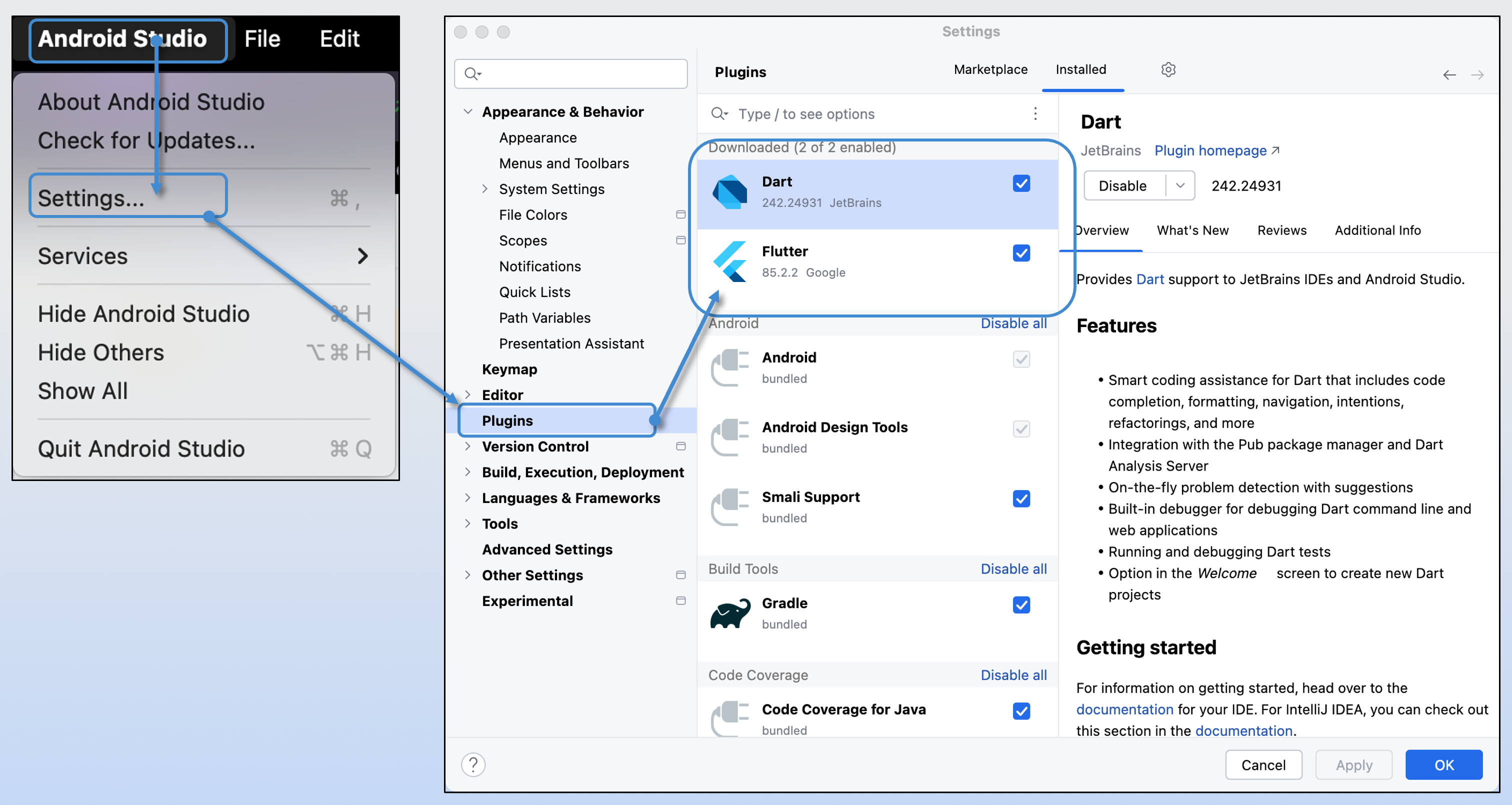 If Flutter and Dart plugins are not installed in Android Studio, please refer to: Installing Flutter and Dart Plugins.
